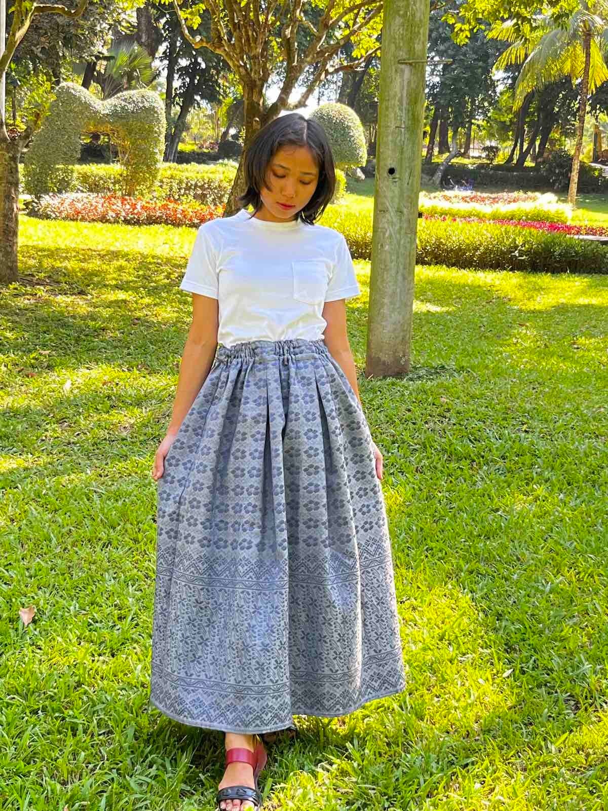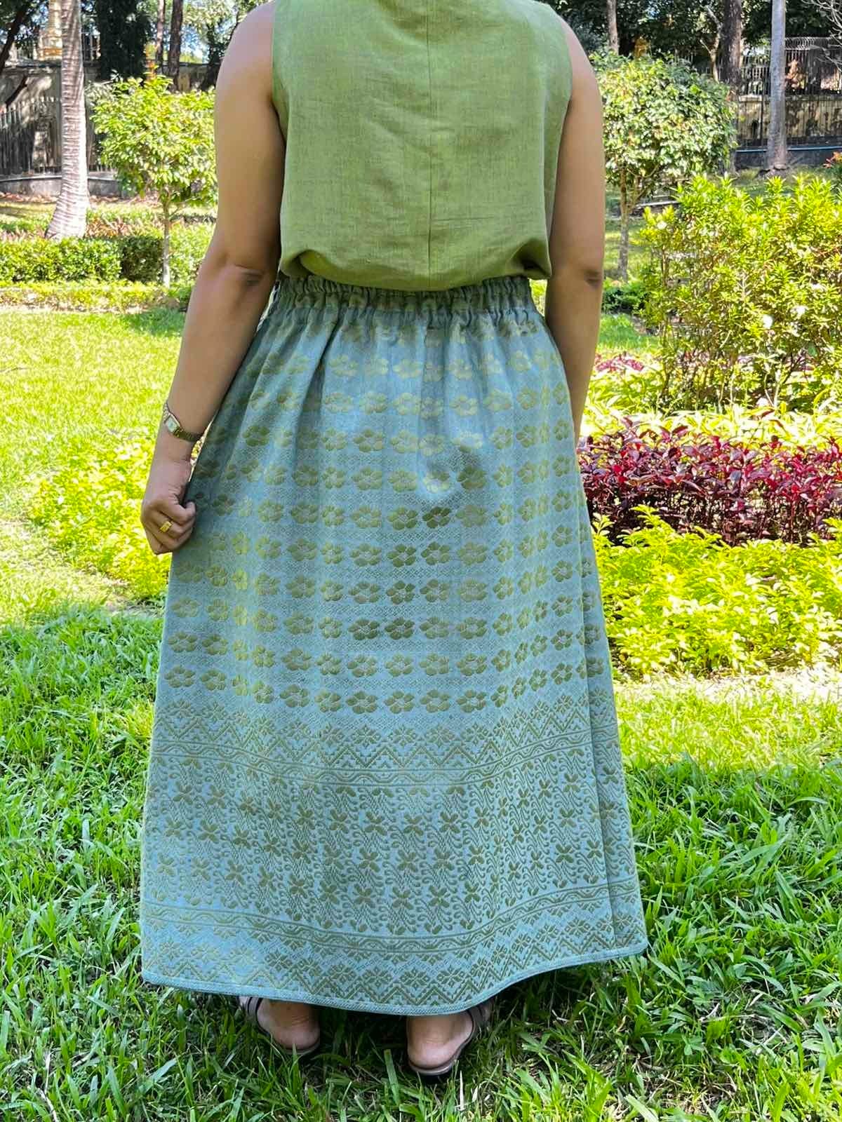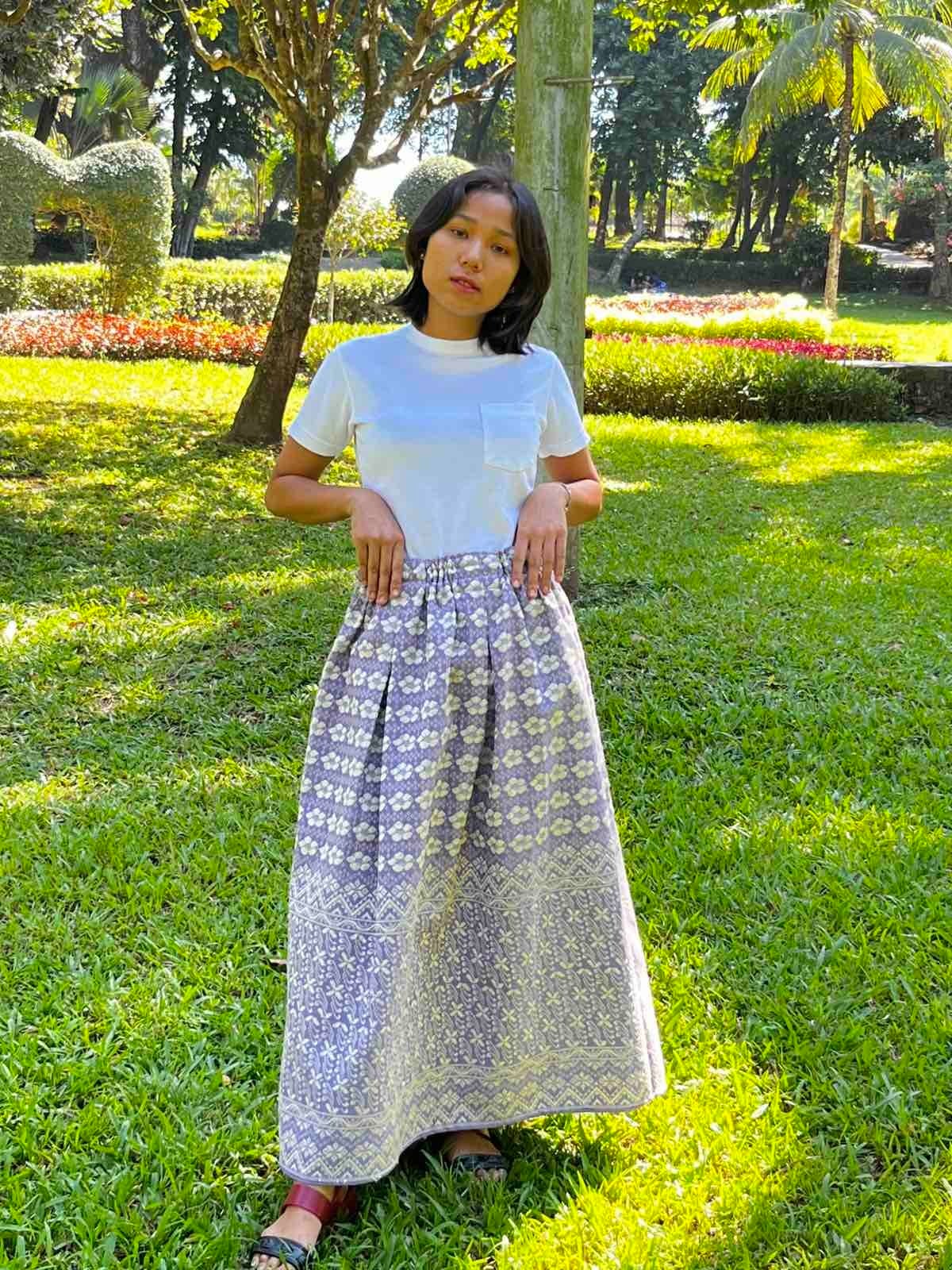 ミャンマー織物で作られており、スカート全体に美しい花柄があしらわれています。