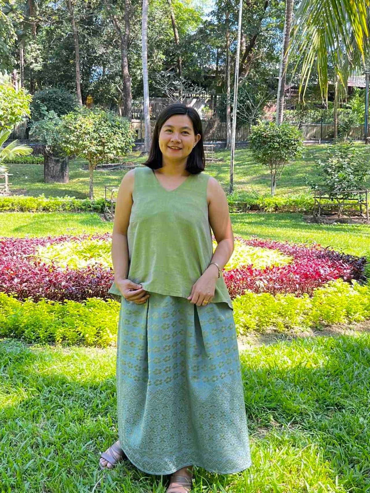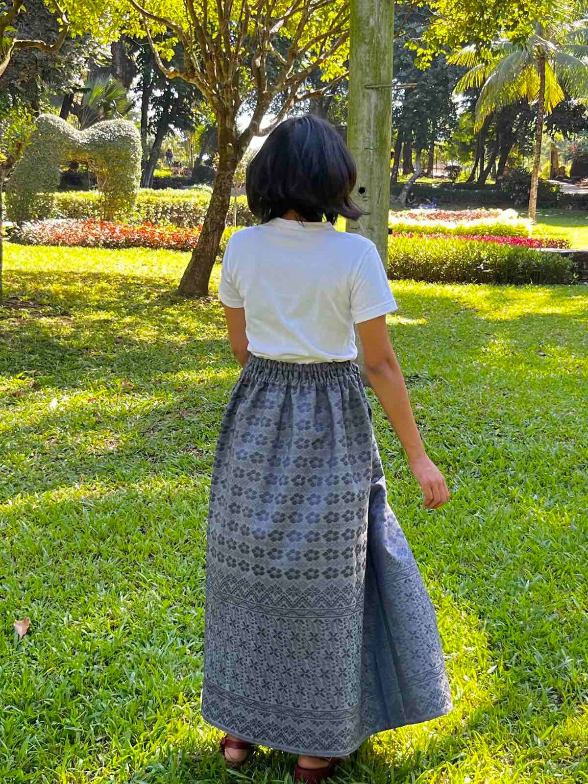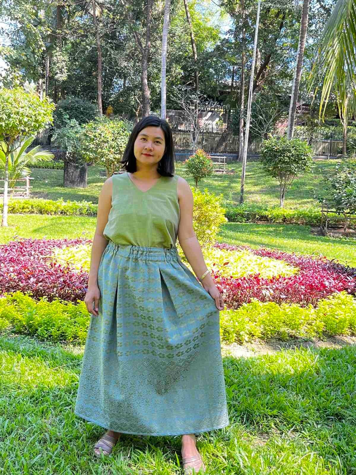 ミャンマー織物で作られており、スカート全体に美しい花柄があしらわれています。