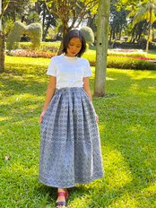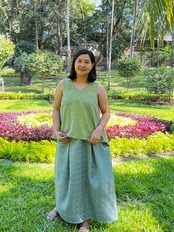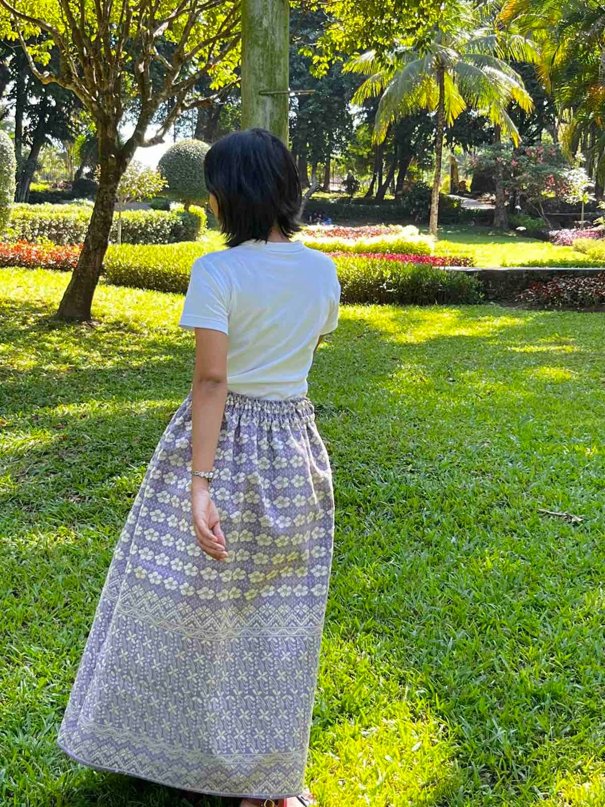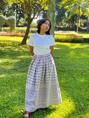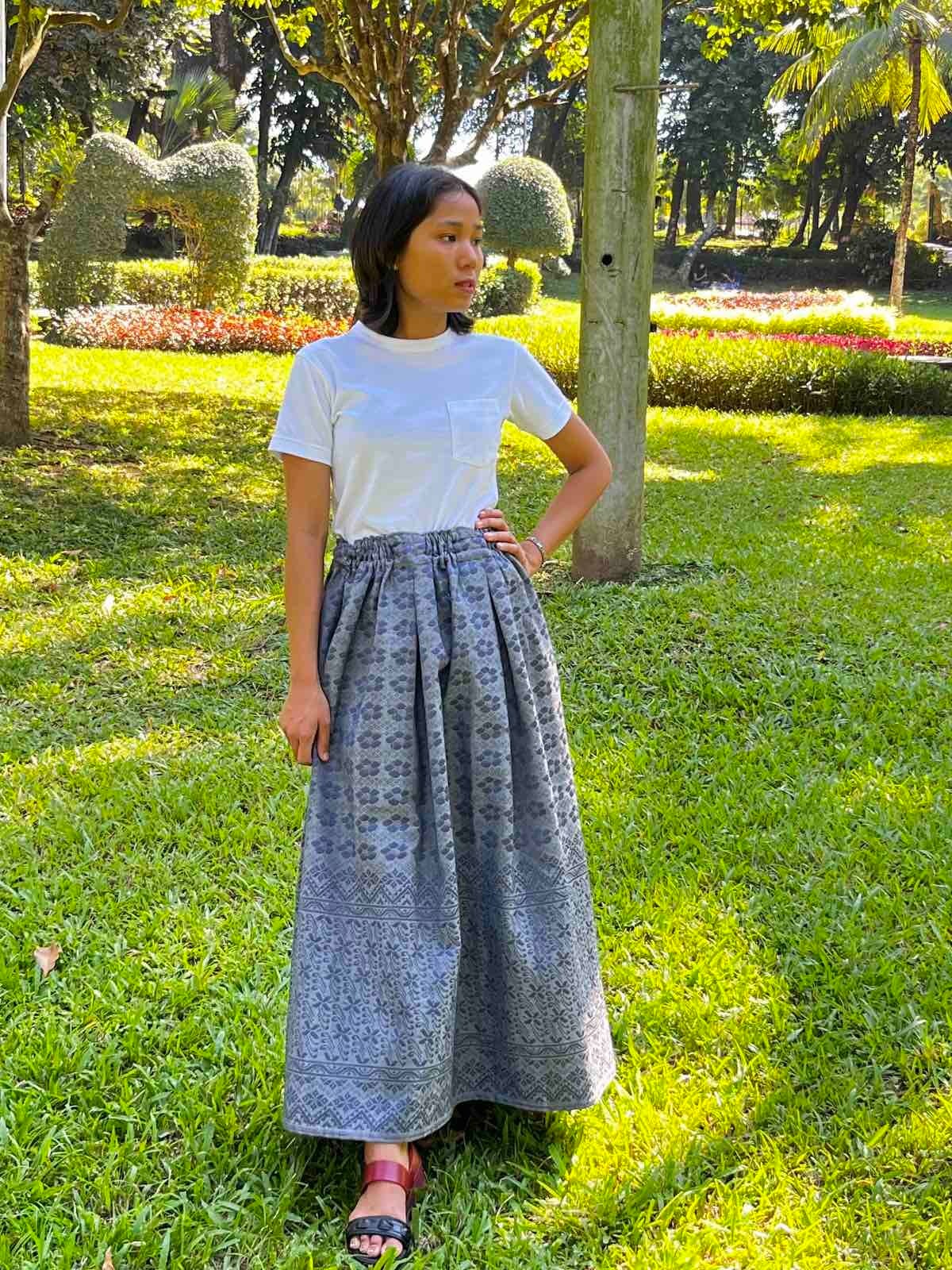 こちらは、花柄のミャンマー伝統織物を使用した、着やすいロングスカートです。