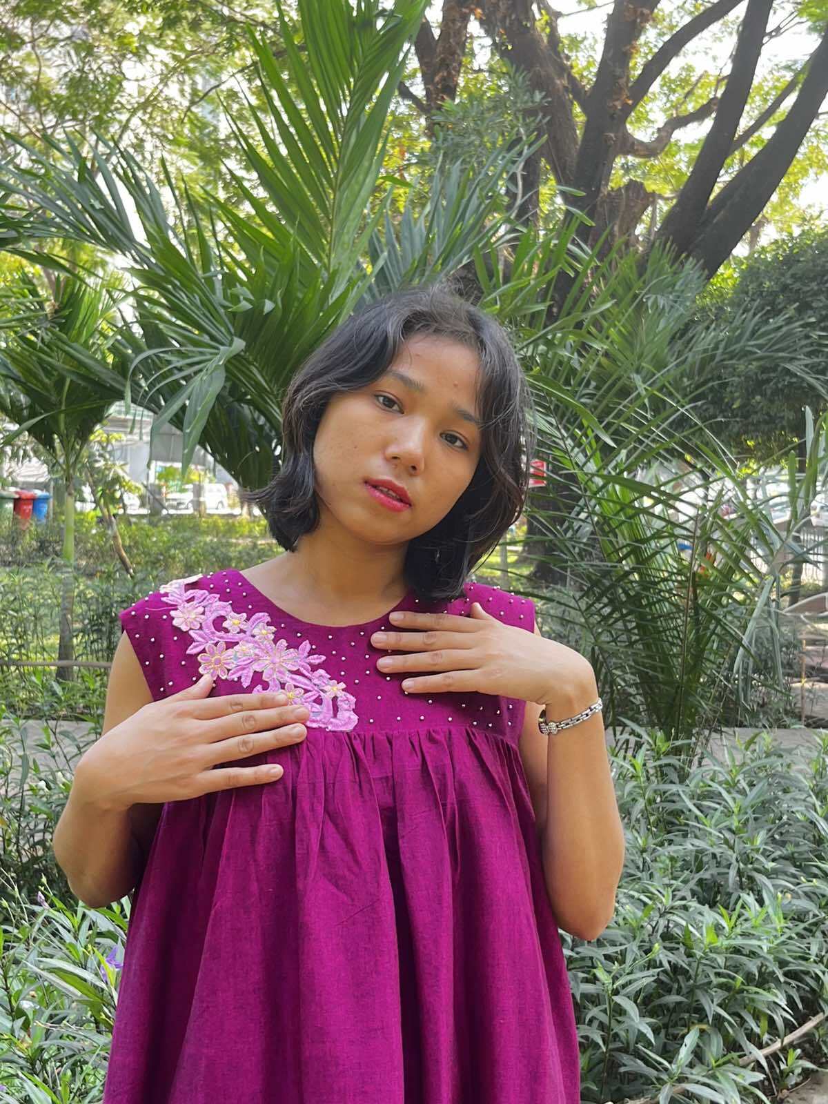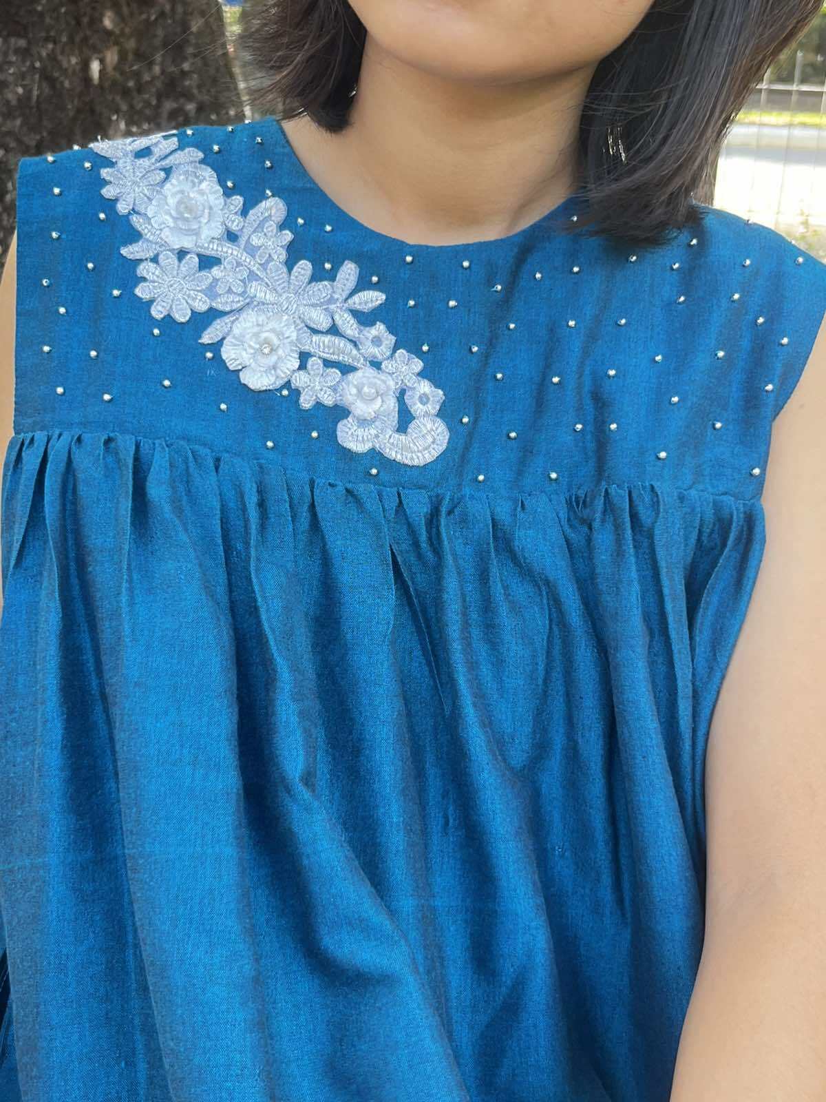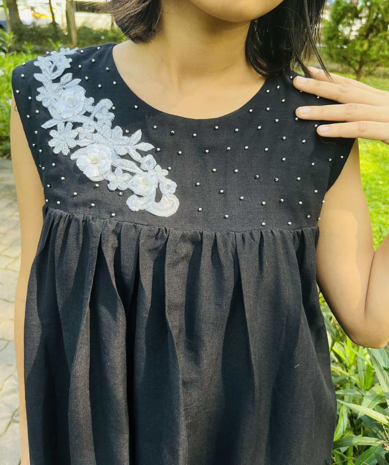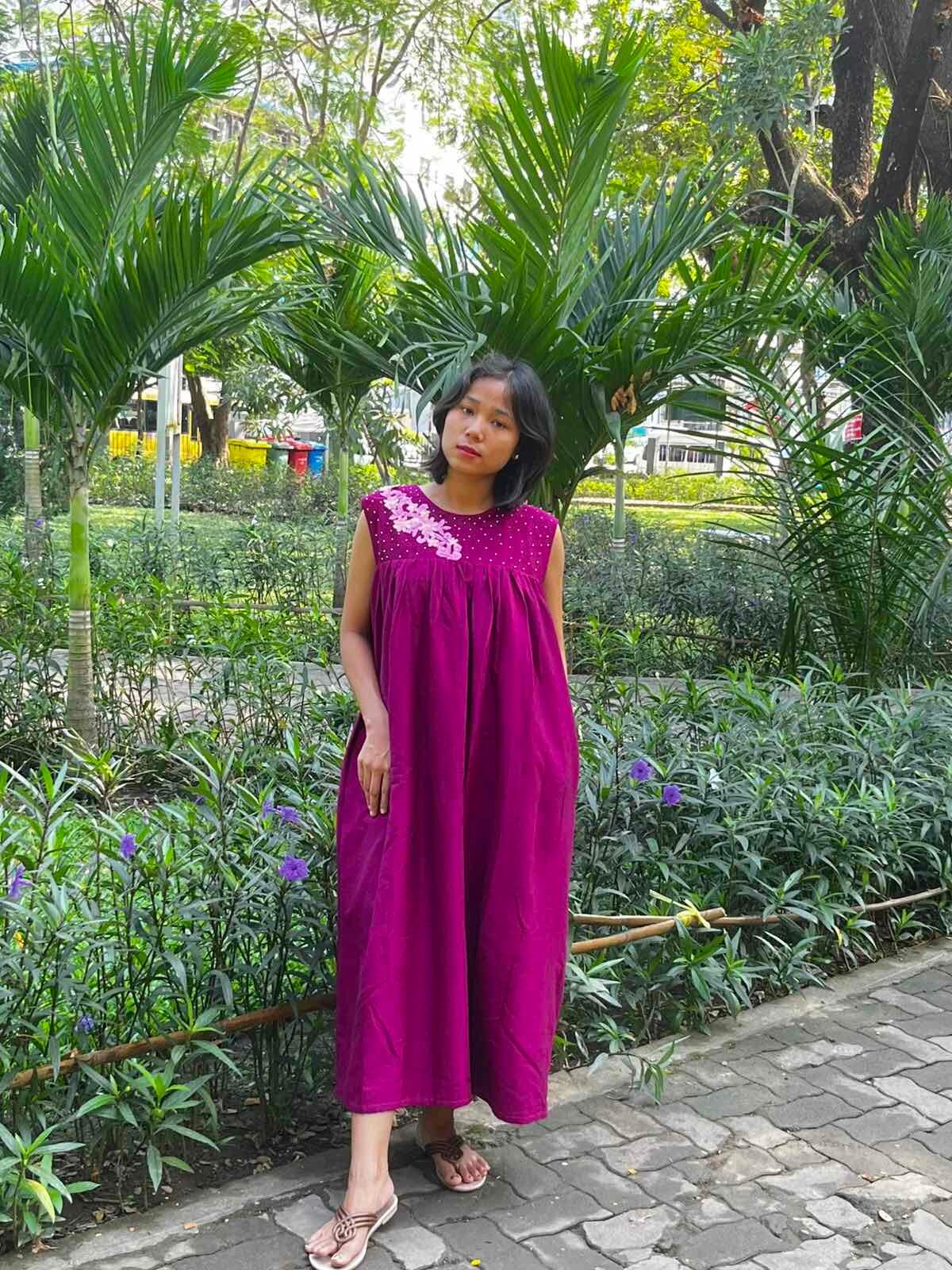 この可愛らしいガウンのデザインは、胸元のサイド部分に花のモチーフとビーズ刺繍が施されており、見た目に華やかさと個性をプラスしています。