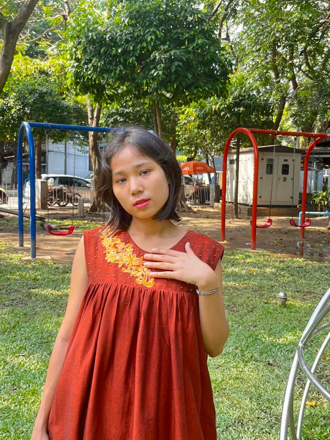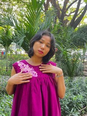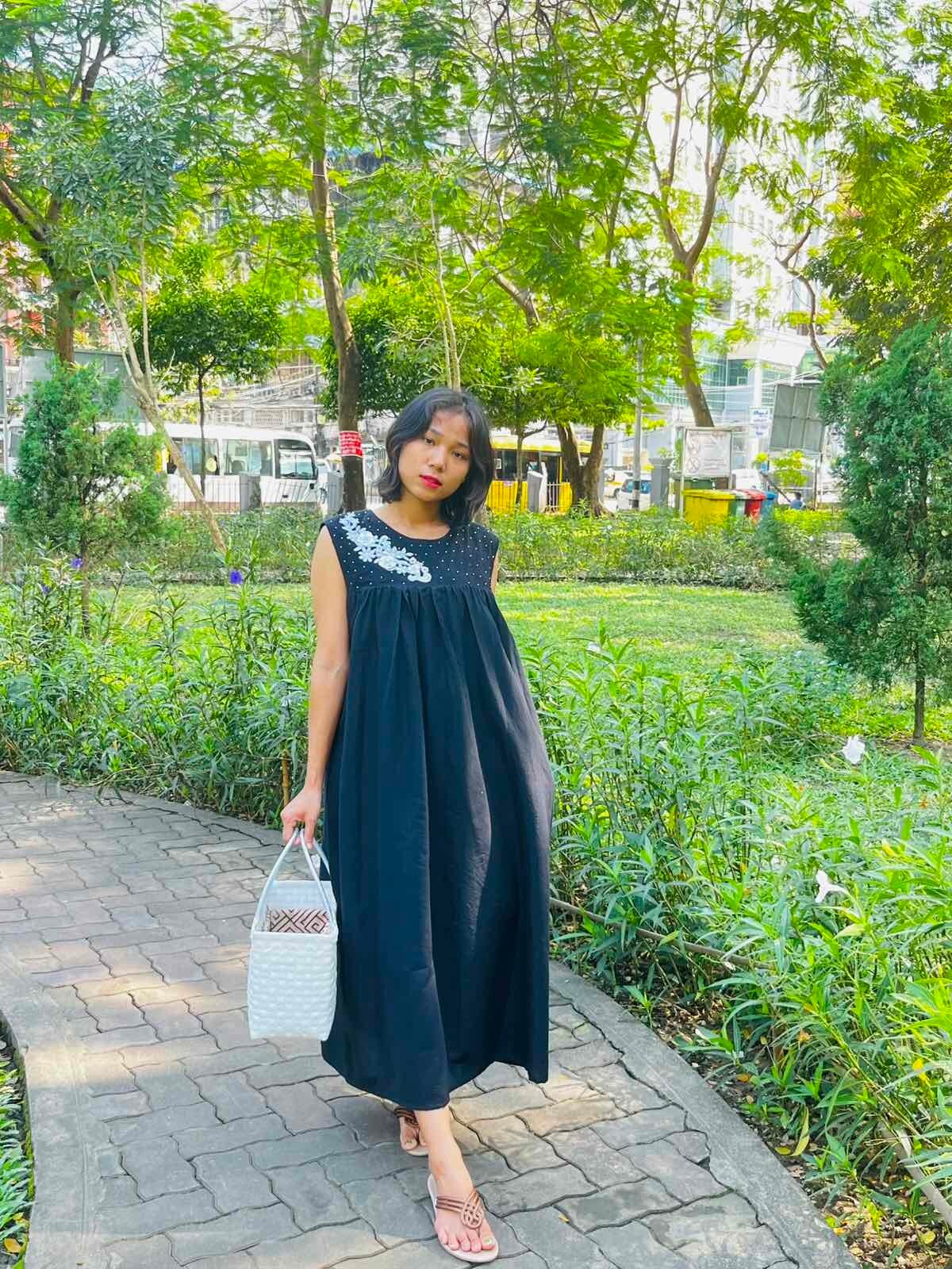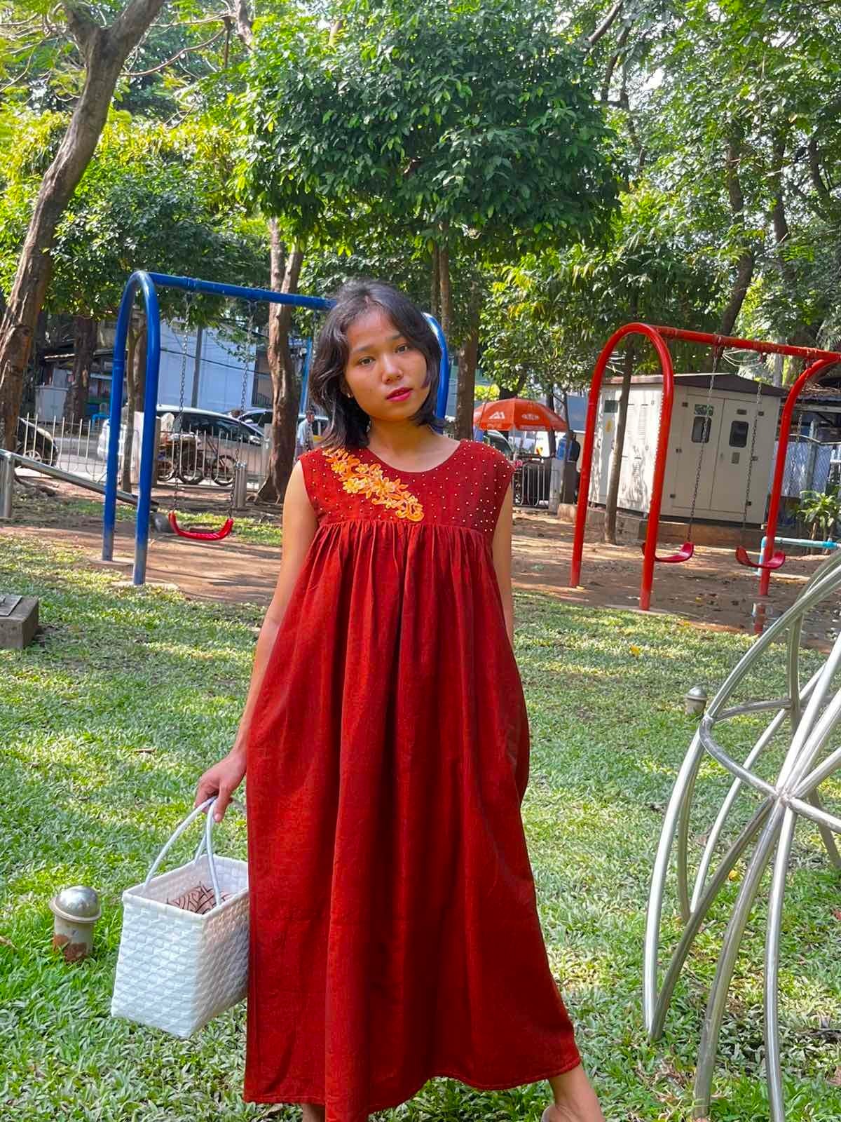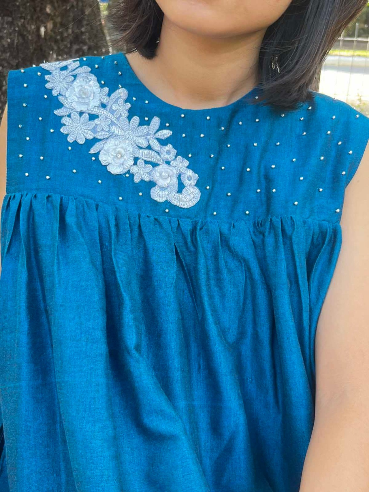 この可愛らしいガウンのデザインは、胸元のサイド部分に花のモチーフとビーズ刺繍が施されており、見た目に華やかさと個性をプラスしています。