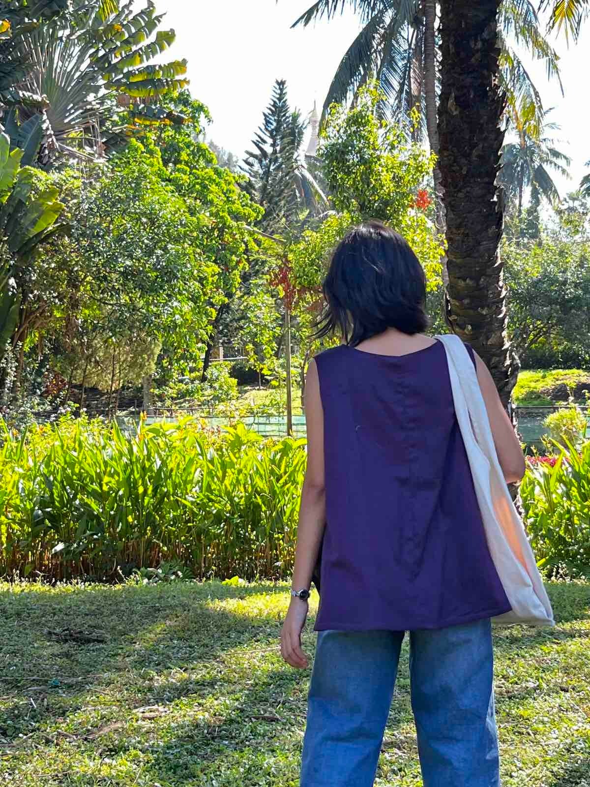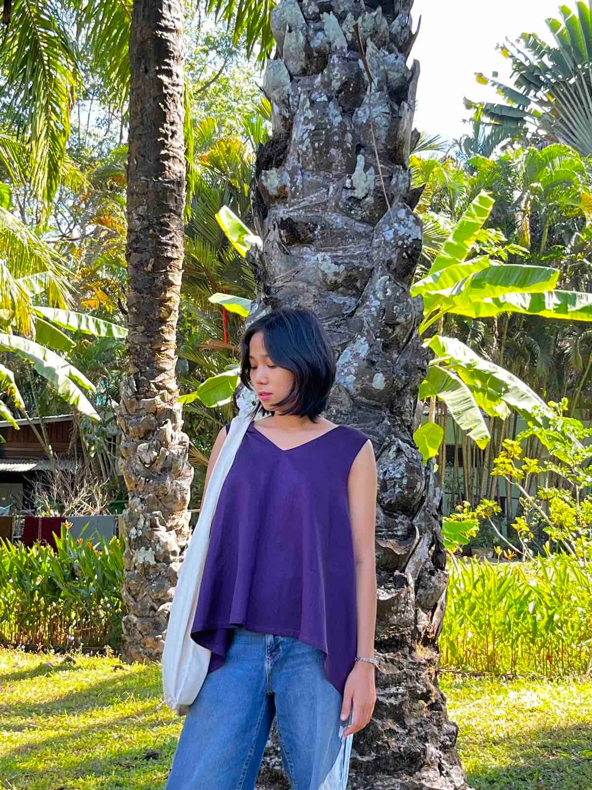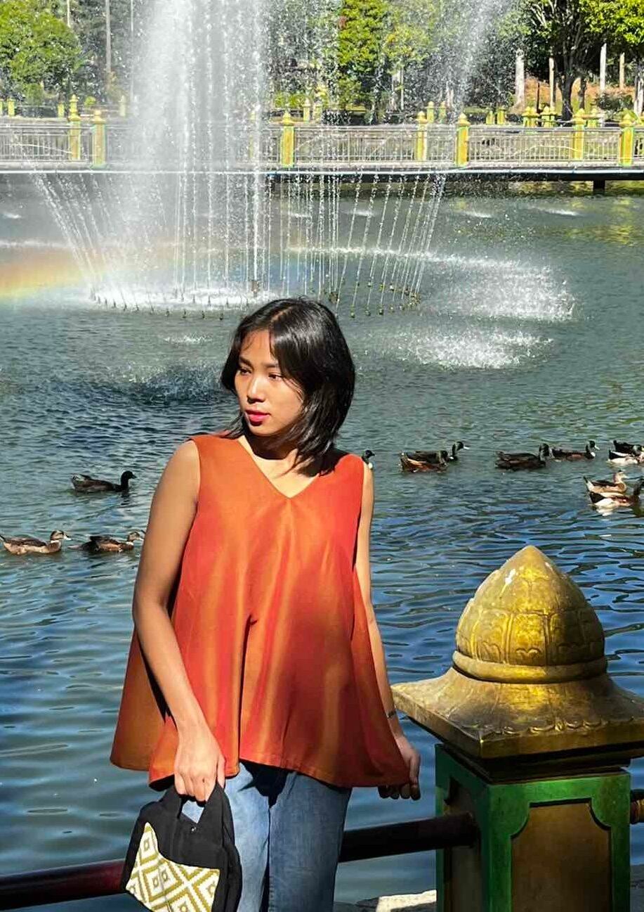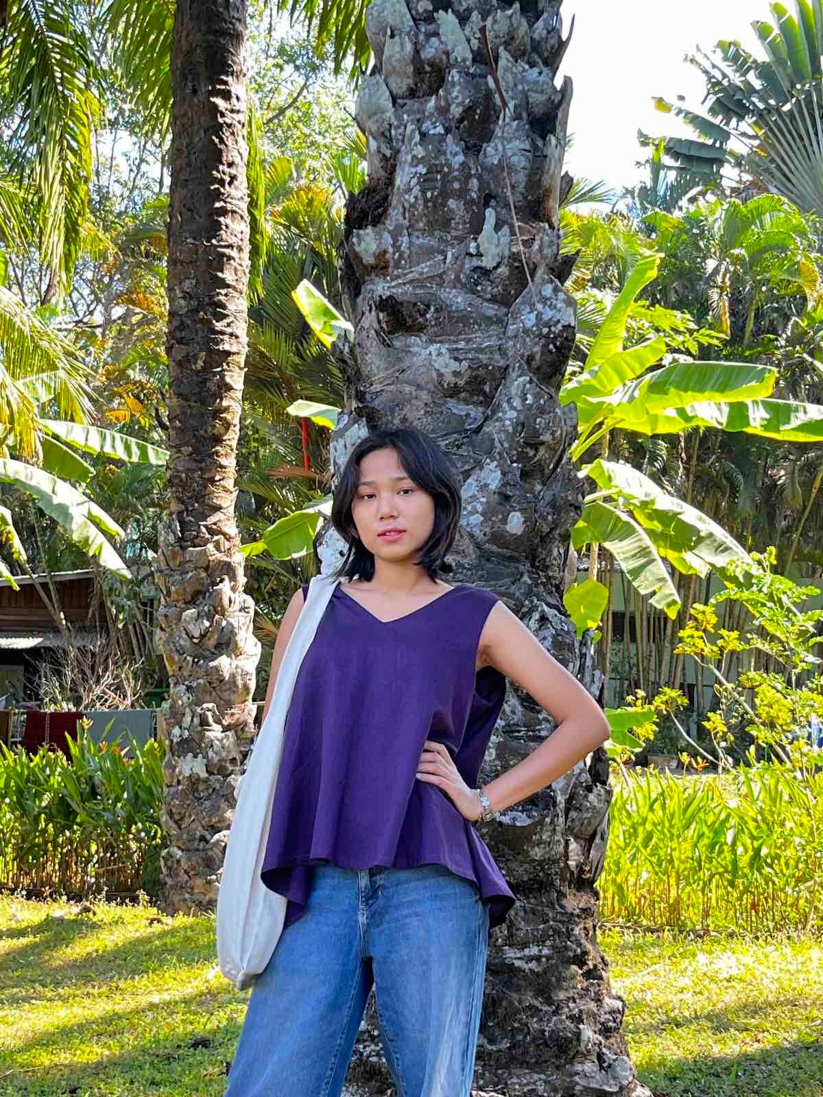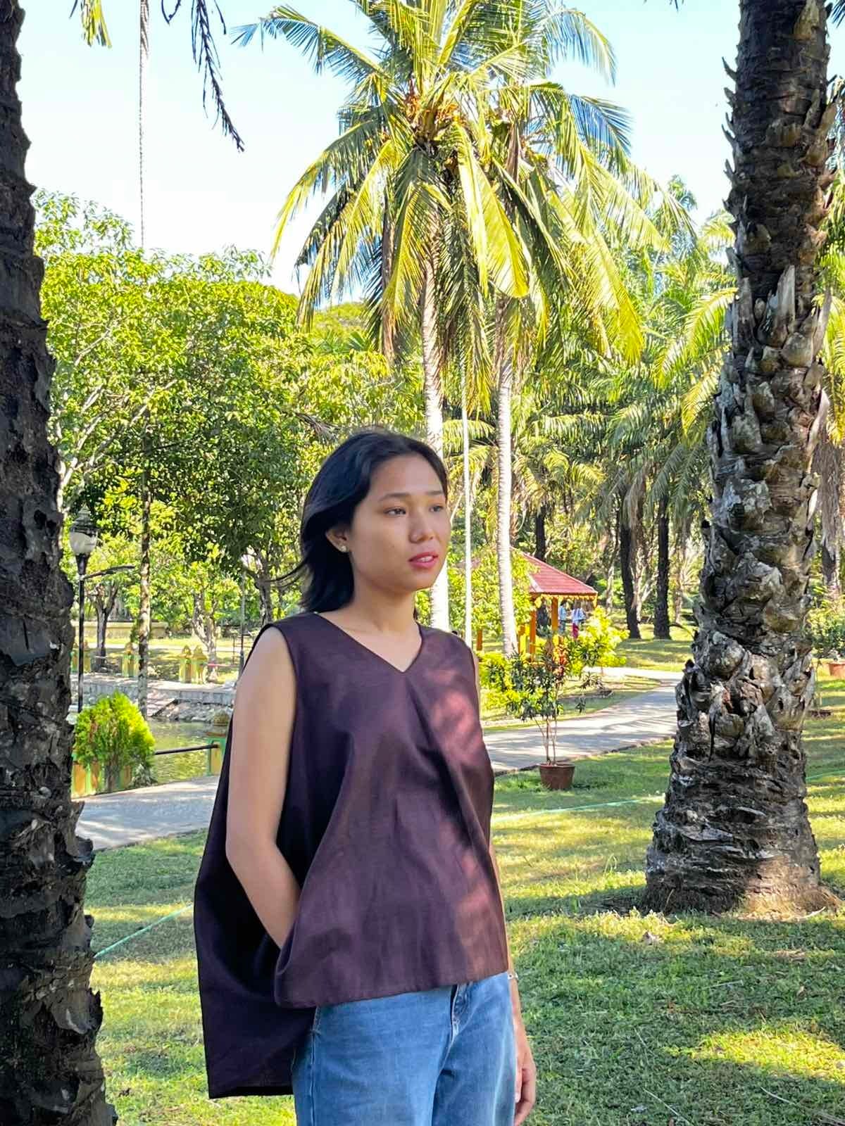 ミャンマーのマンダレー地域にある織物の町、アマラプラで織られているコットン布のゆれるブラウスです。