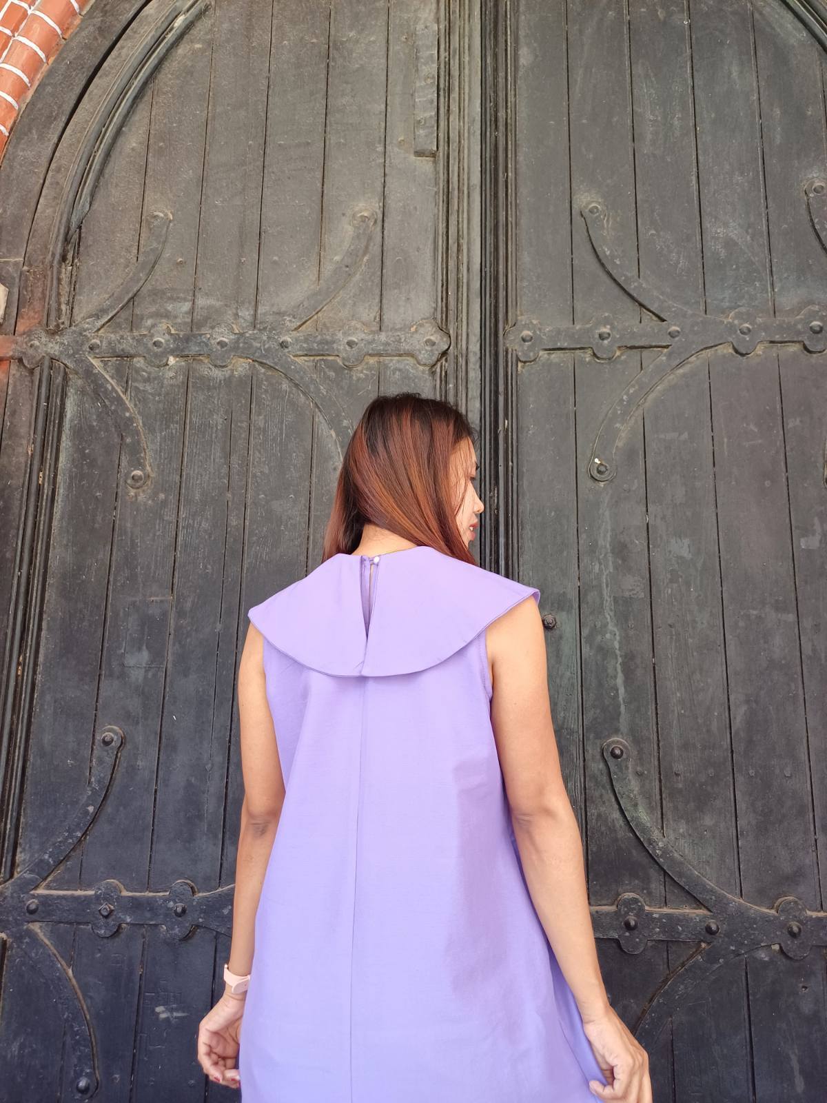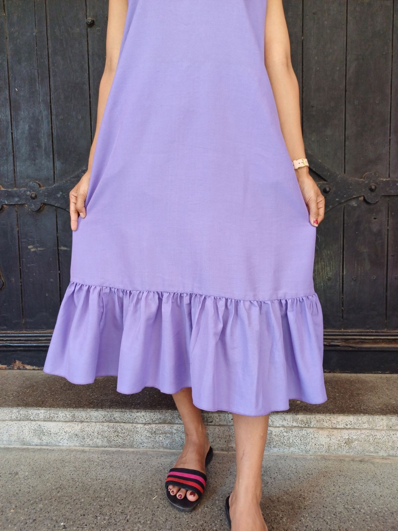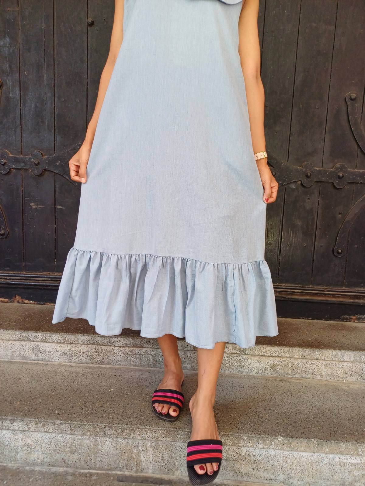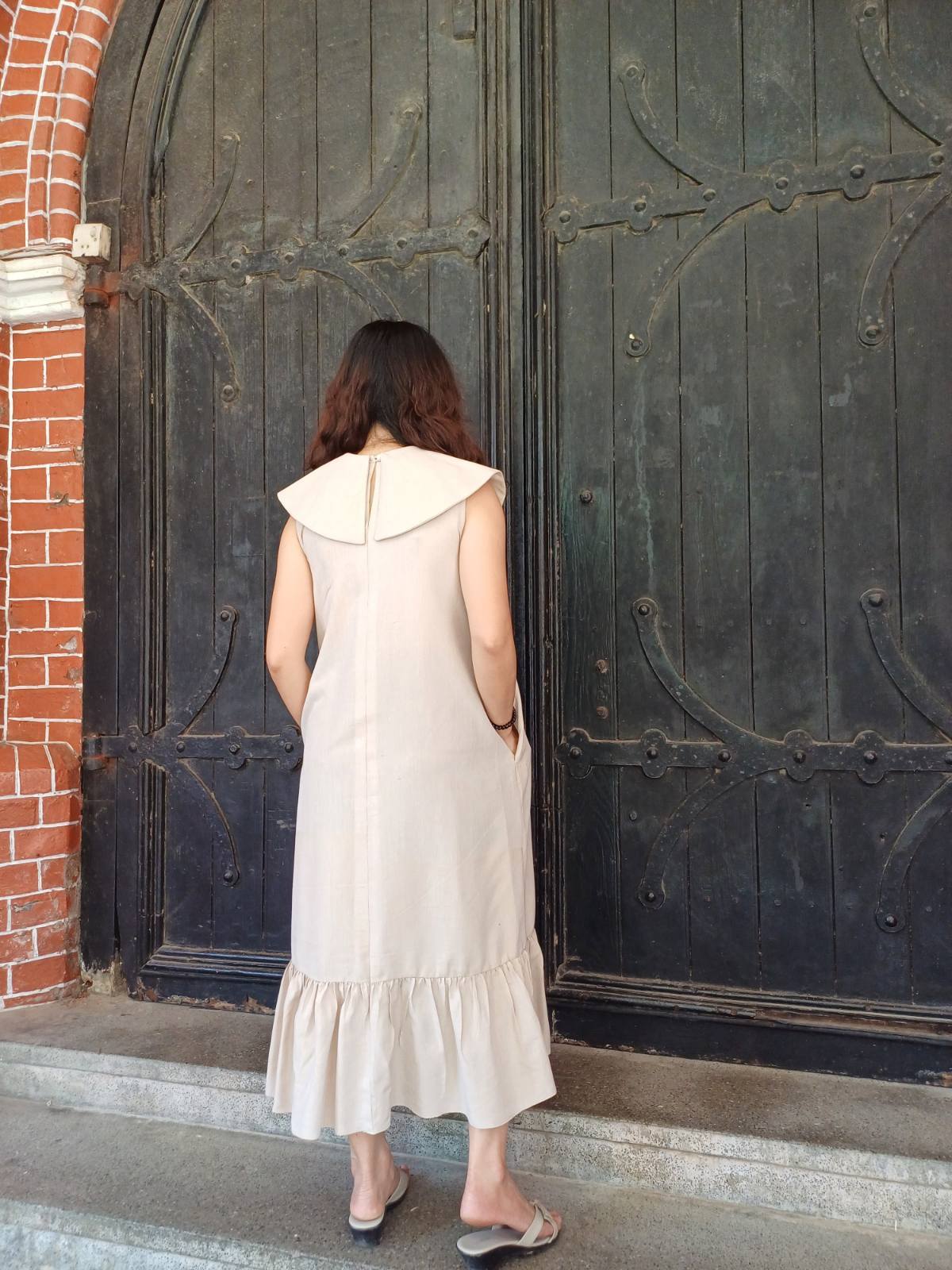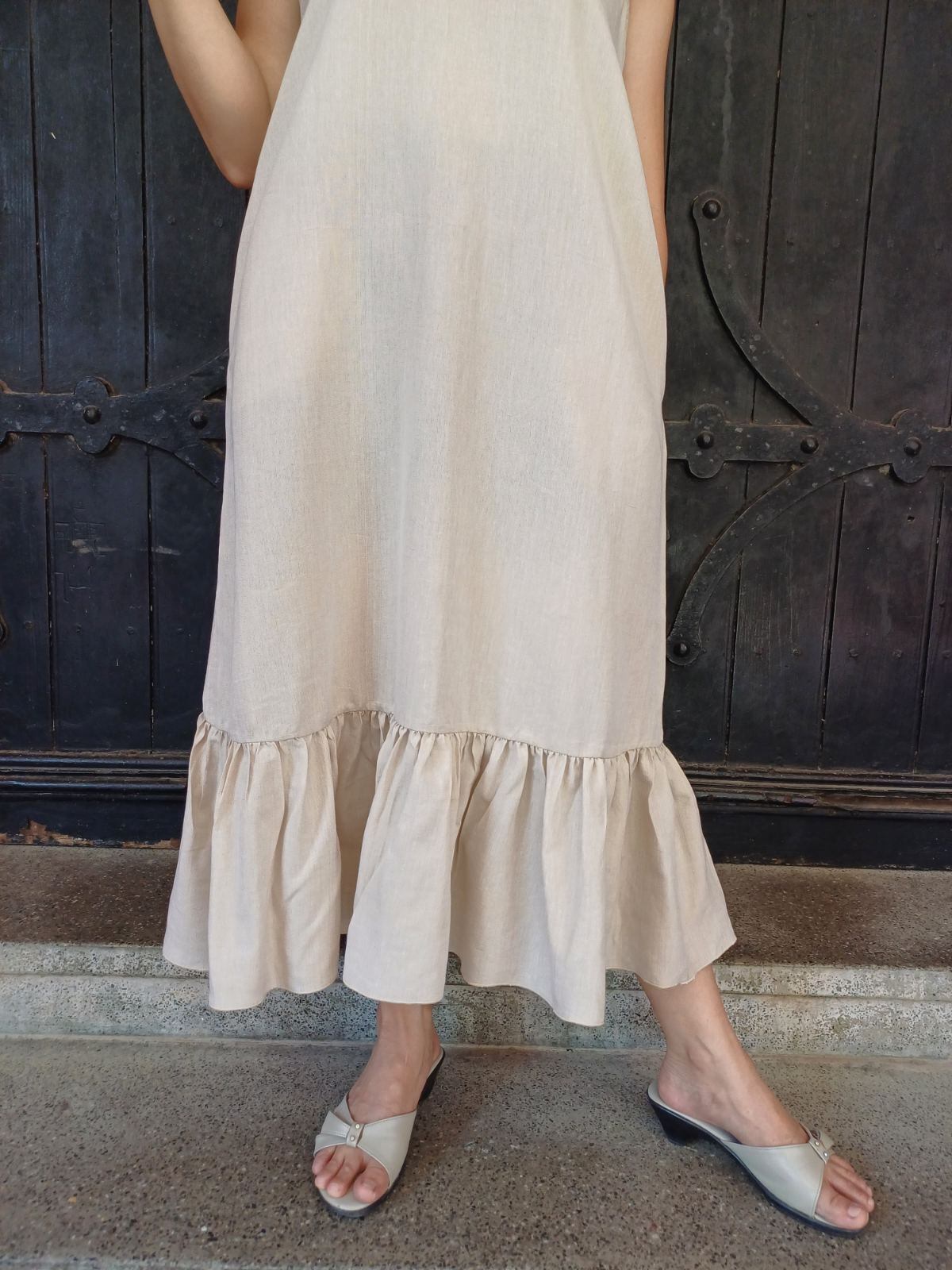 袖のないスッキリとしたデザインに、裾の柔らかなラッフル(フリル)が加わることで、歩くたびに美しく揺れるフェミニンなシルエットを実現しました。