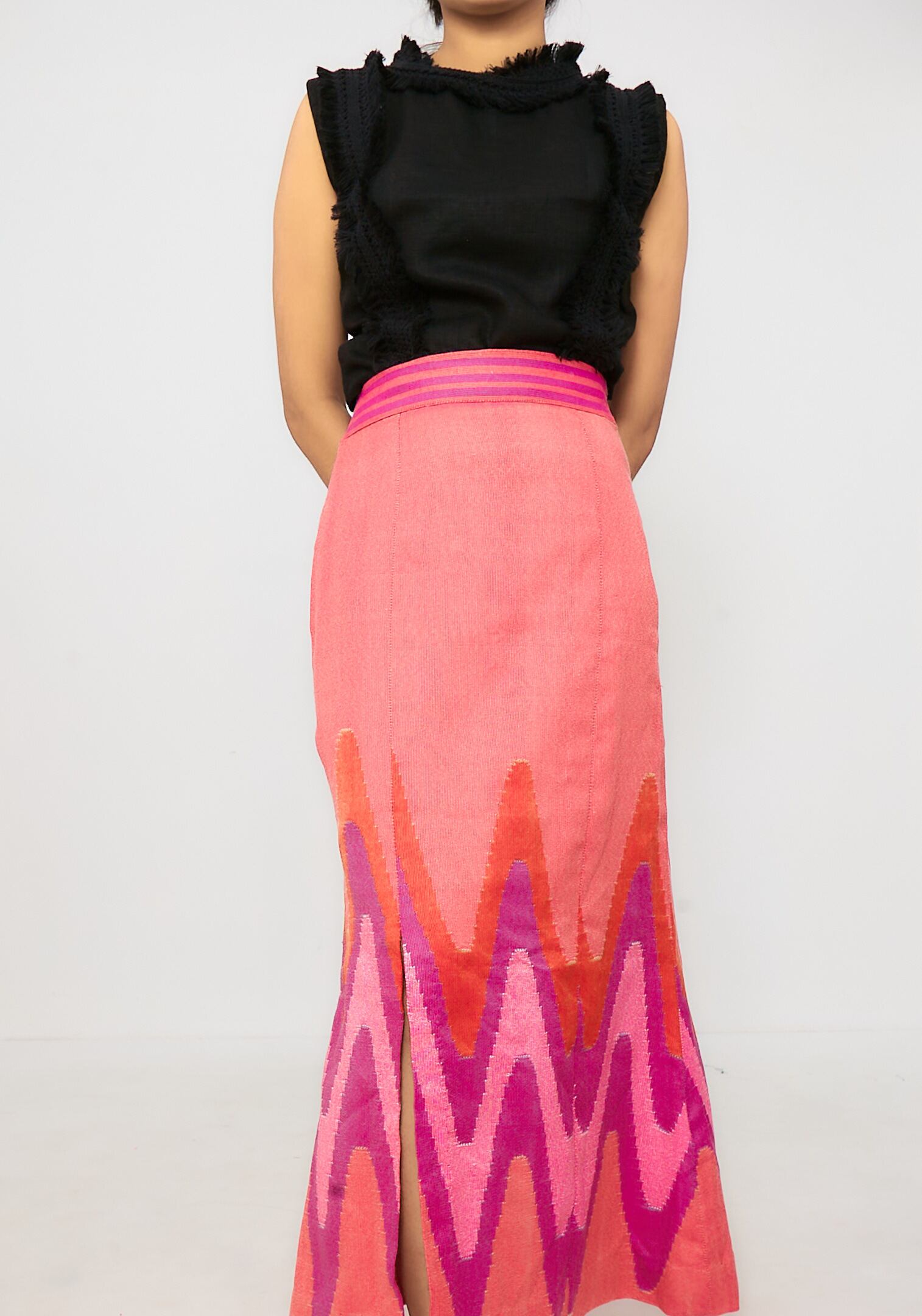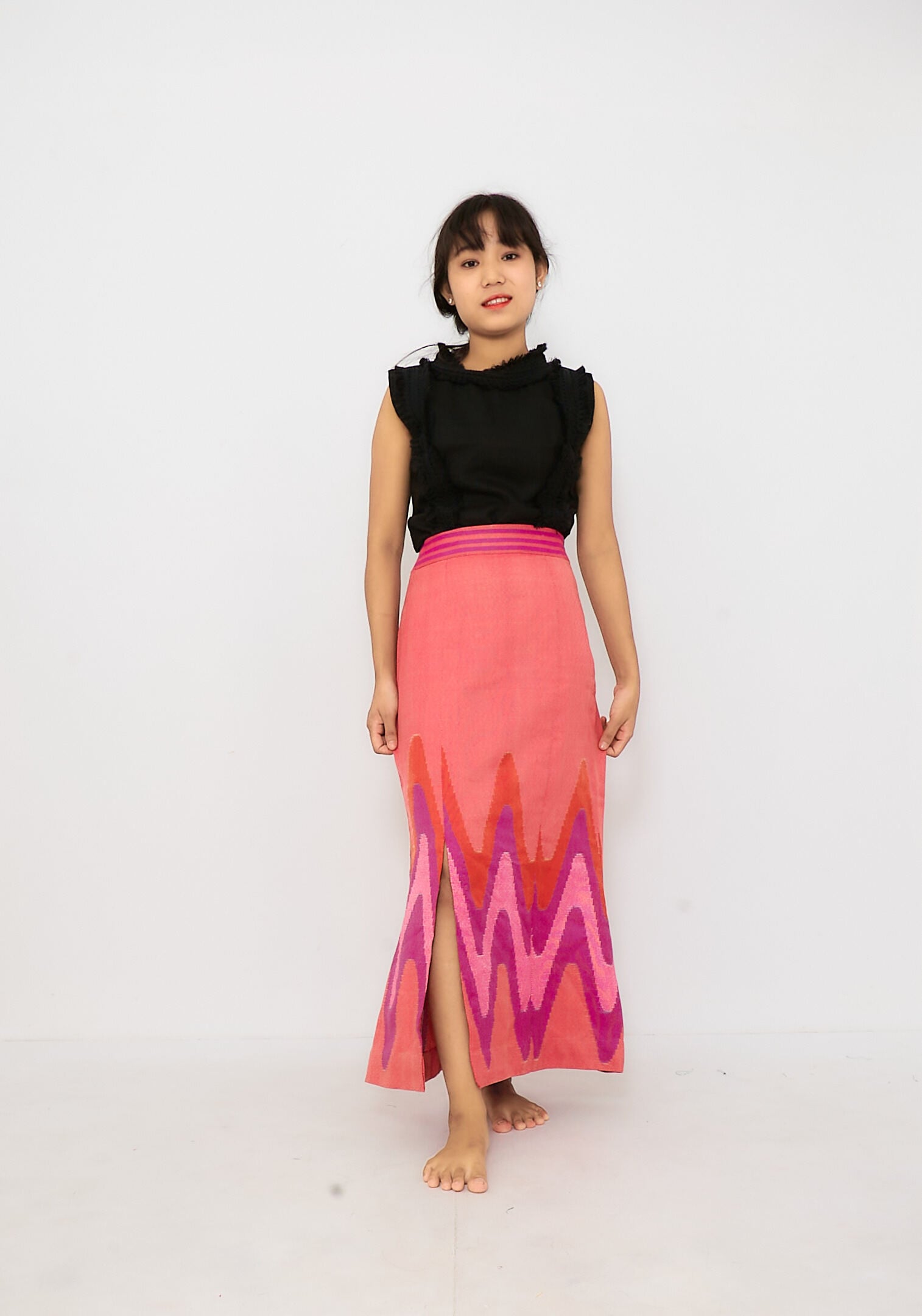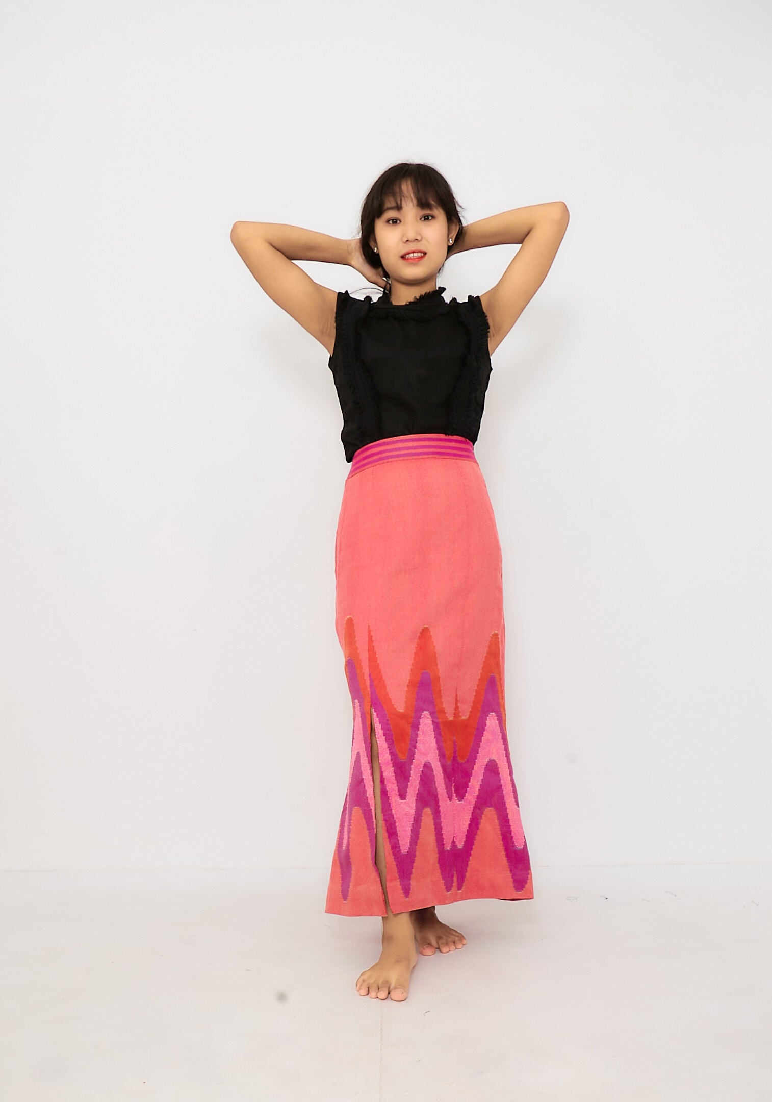 ミャンマーの伝統的なアチェイ布を使用したマーメイド型のスカートです。豊かな色彩と独特な柄が魅力で、着るだけで華やかな印象を与えます。