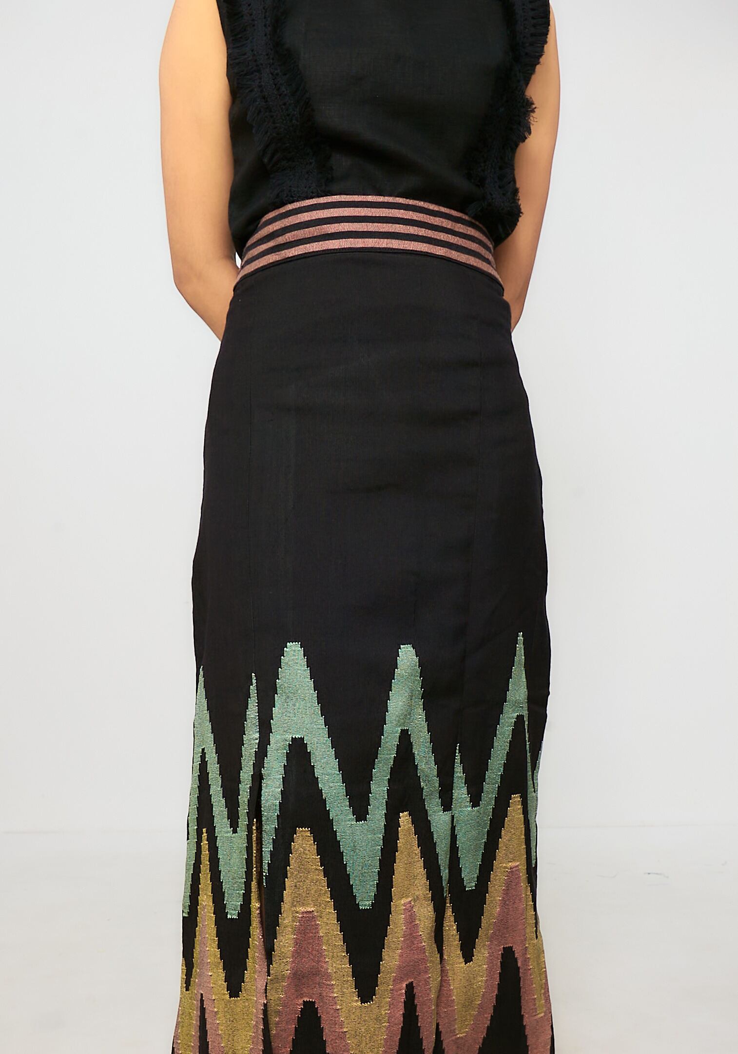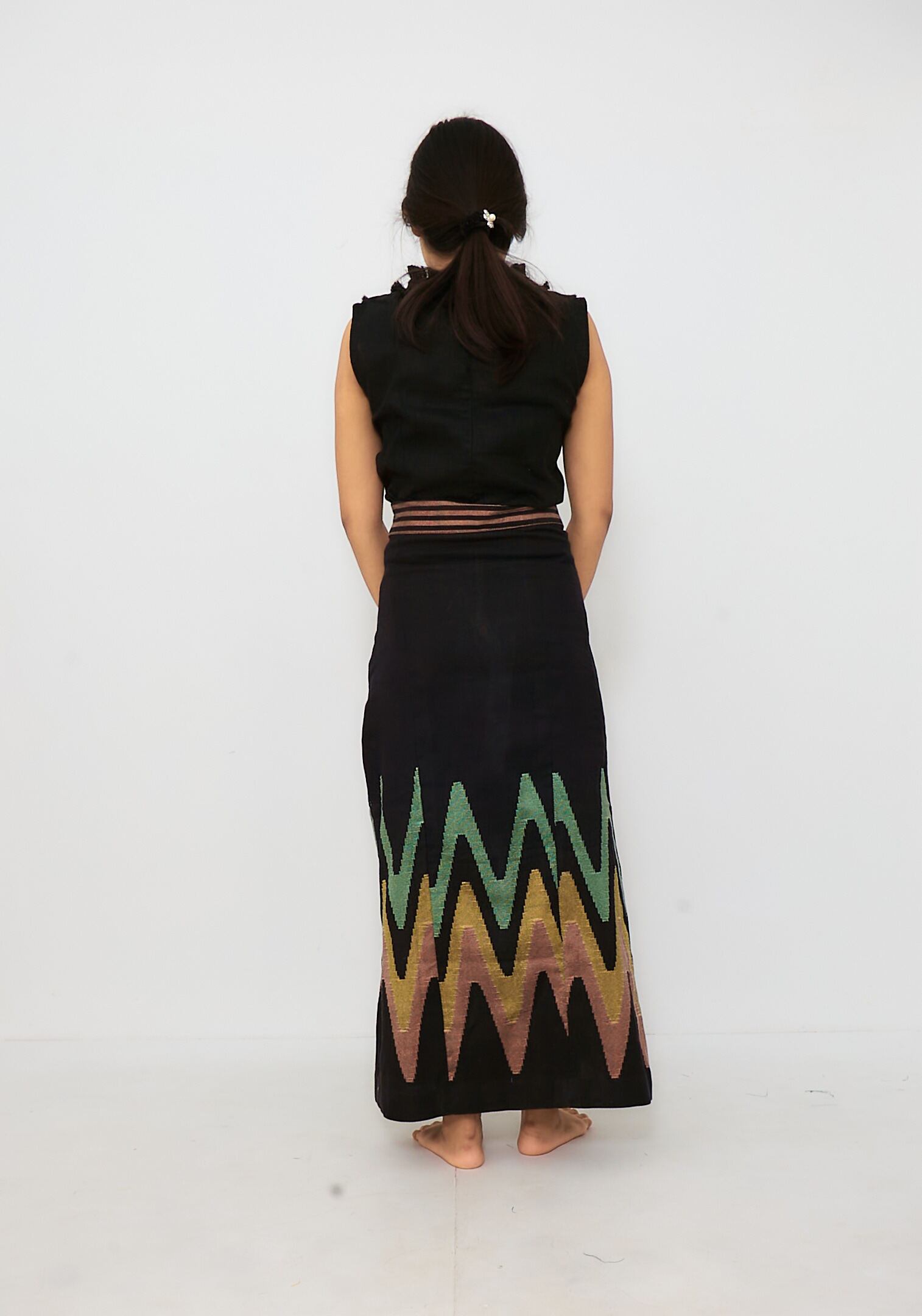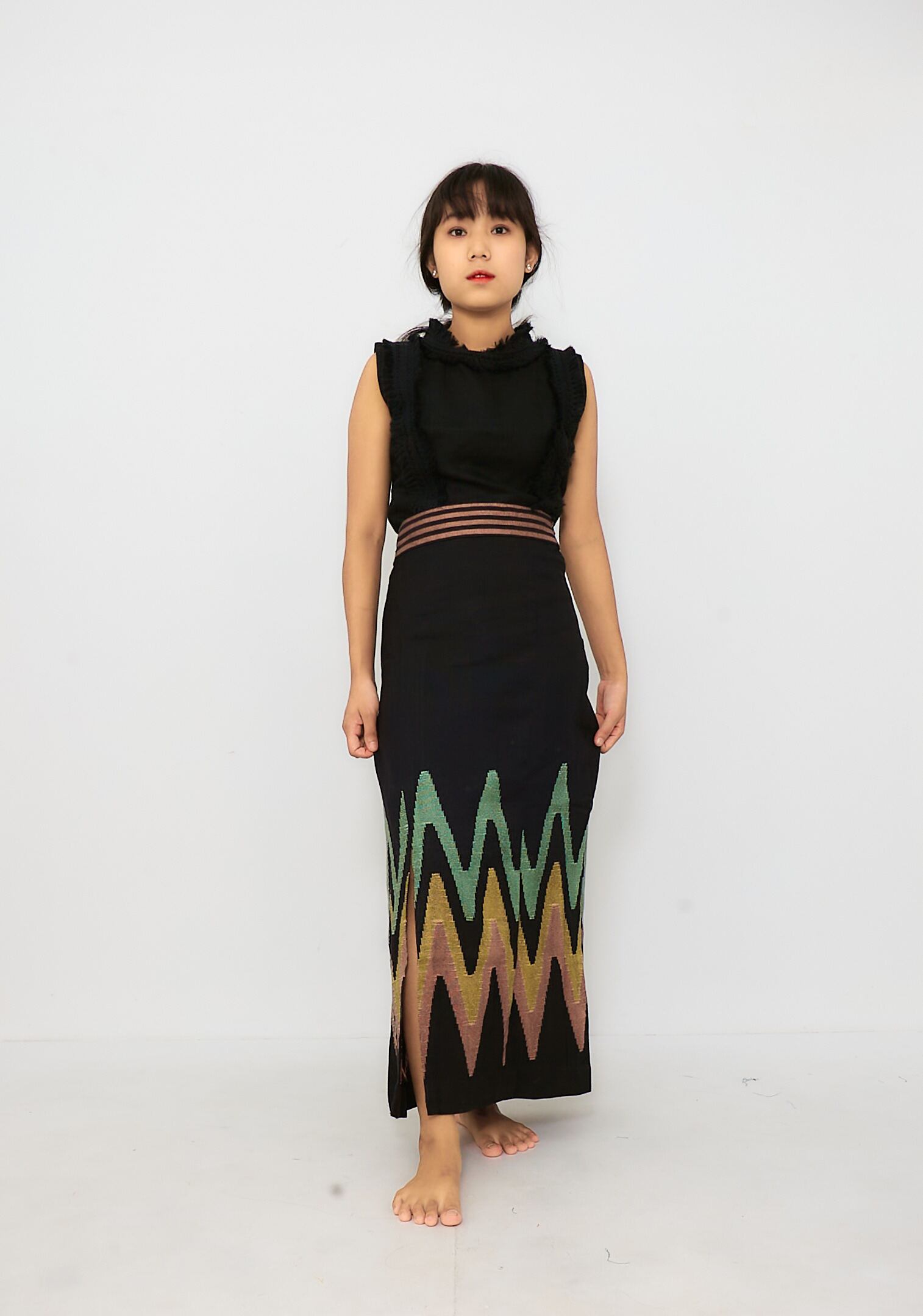 ミャンマーの伝統的なアチェイ布を使用したマーメイド型のスカートです。豊かな色彩と独特な柄が魅力で、着るだけで華やかな印象を与えます。
