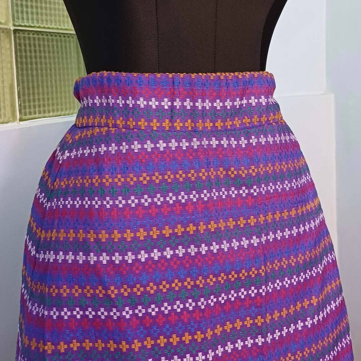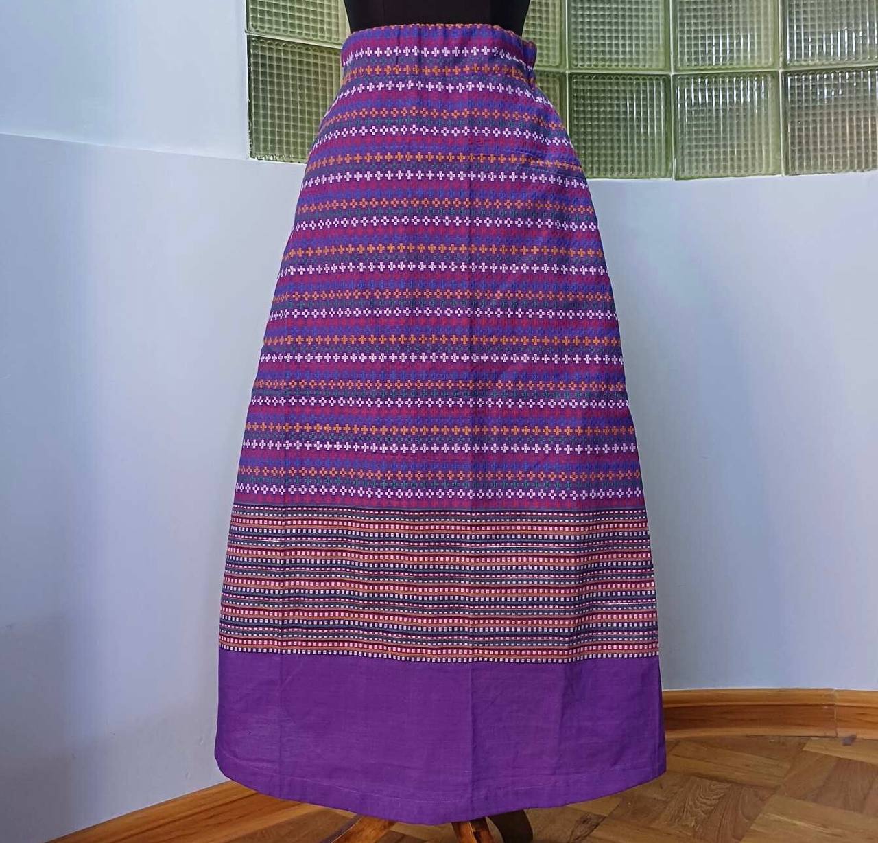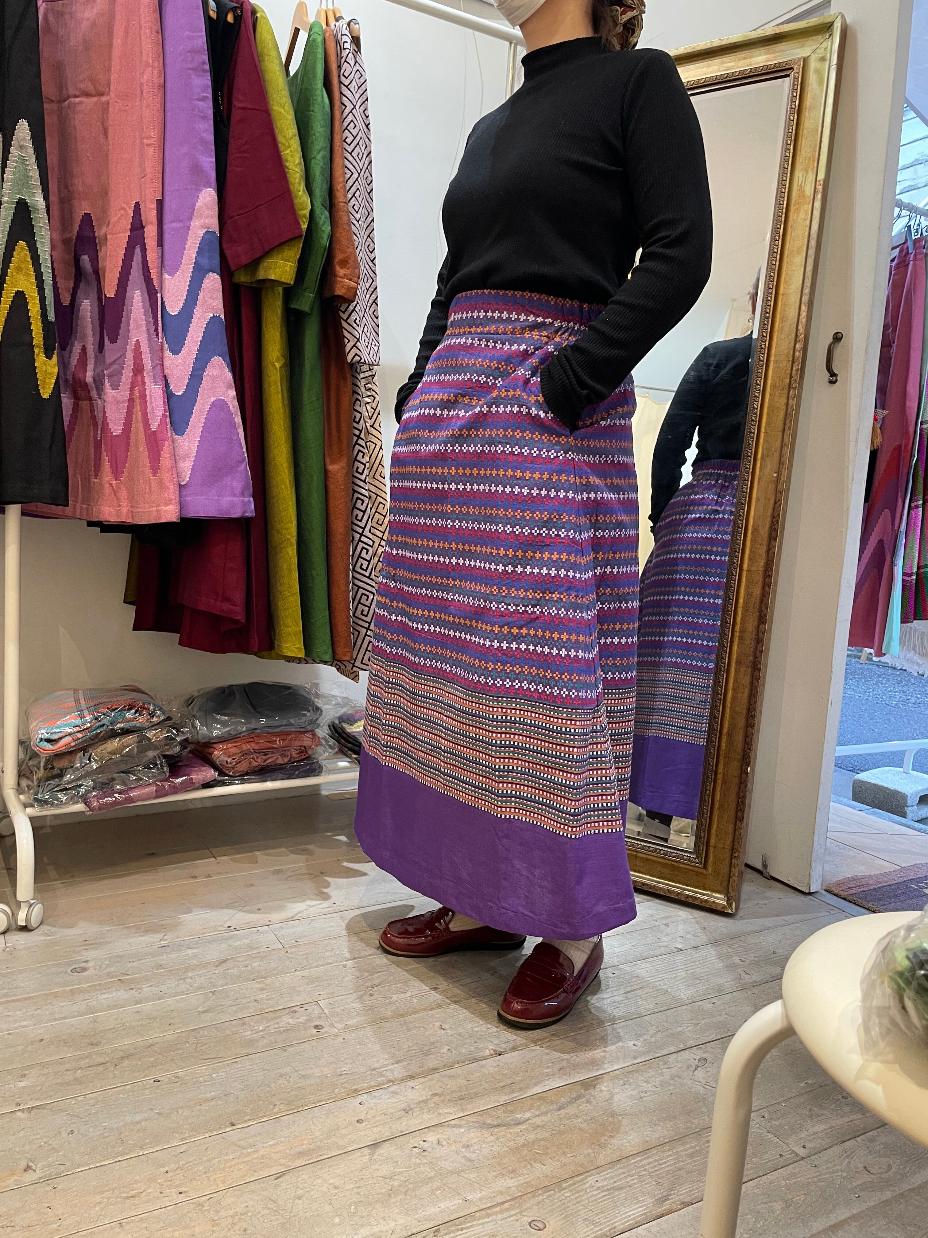 The Mon Classic Semi-Flared Skirt is a flared skirt made with traditional fabric of the Mon people of Myanmar. In Myanmar, it is cherished as formal attire for outings, celebrations, and traditional parties, but it also pairs perfectly with casual tops for everyday wear. This skirt features a semi-flared silhouette that enhances femininity. The elegant purple hue complements any top, allowing you to enjoy stylish coordination.