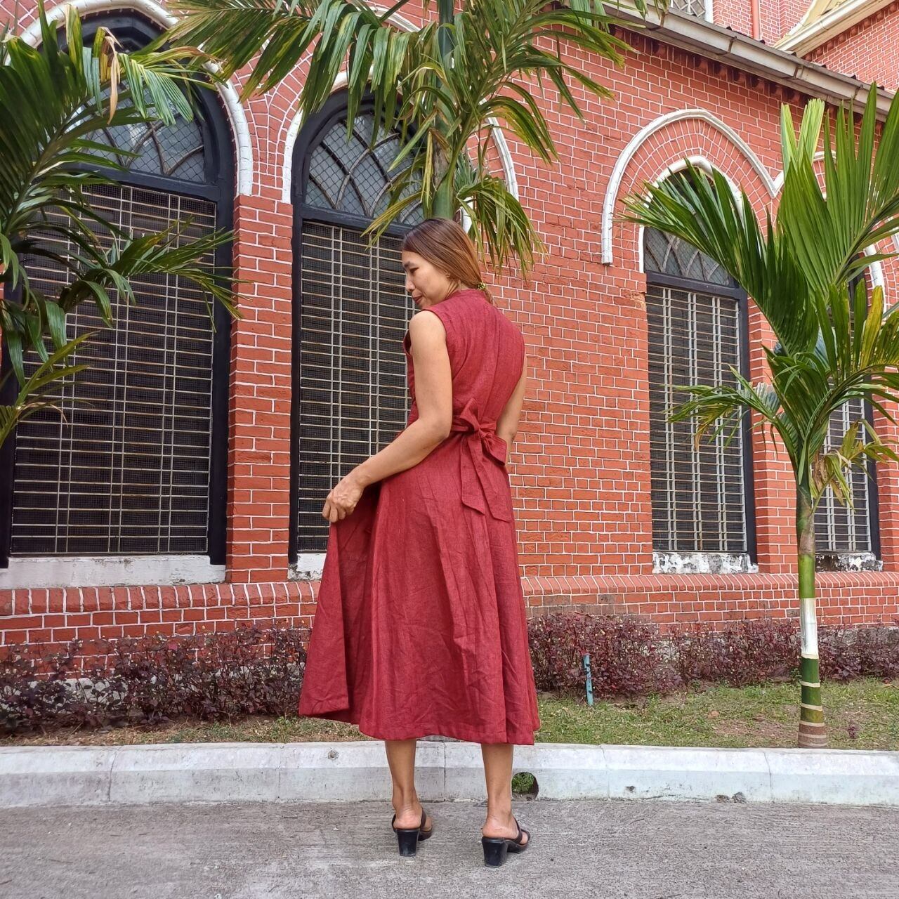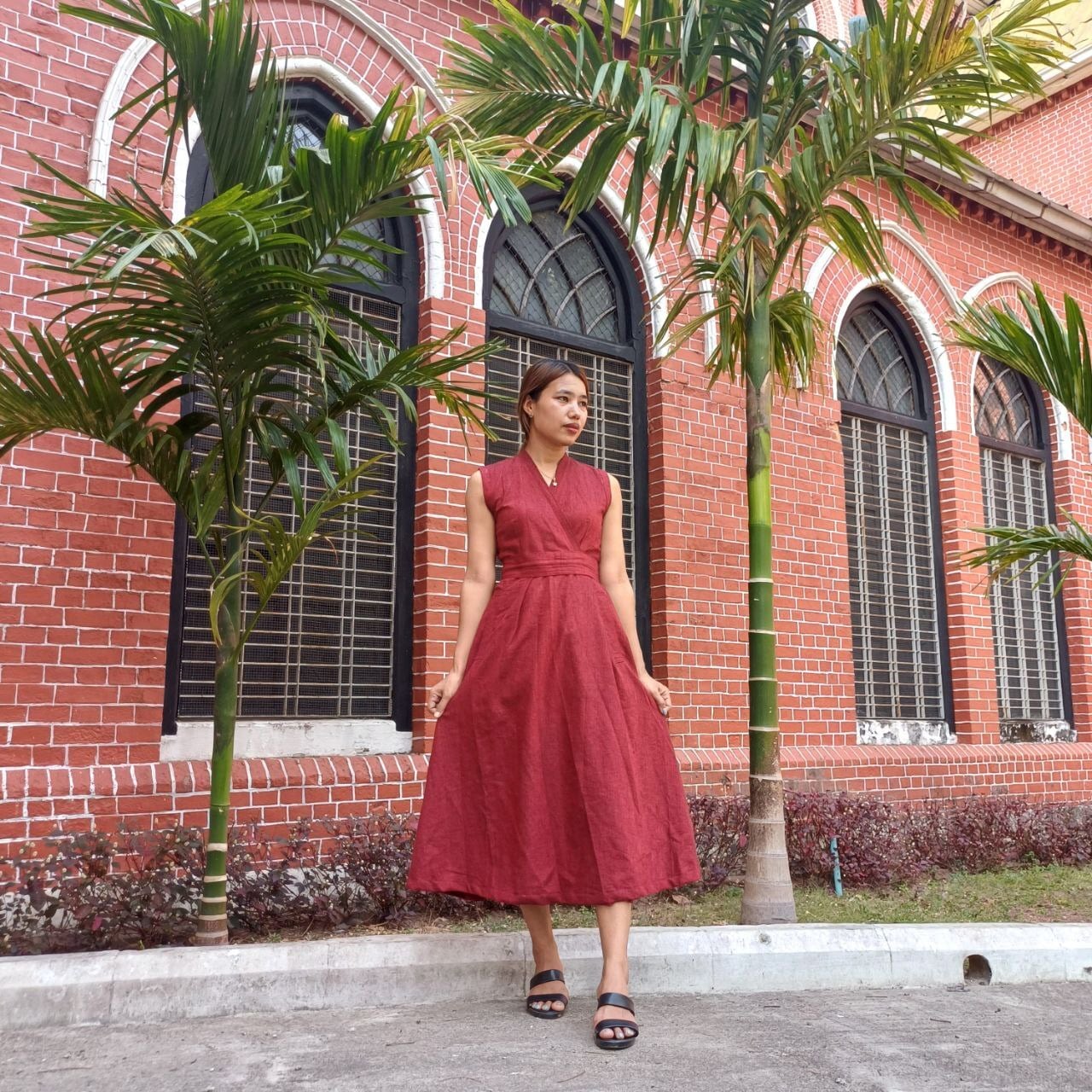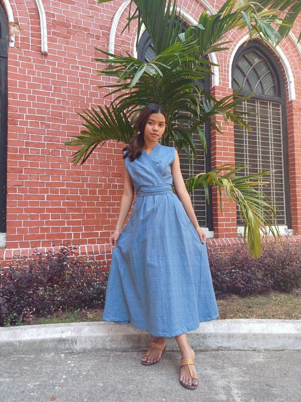 このざっくりとした味わいのある、名産品のインレーコットンを材料としたカジュアルなラップドレスをミャンマー人のおはりこたちが仕立てました。