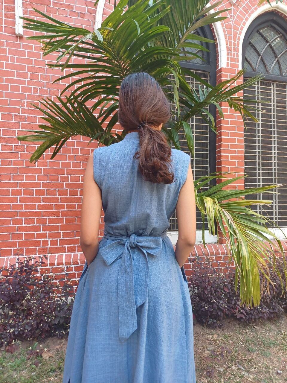 As it's a wrap design, when you layer the dress cover over your thighs, the collar forms a lovely V shape. There's a belt-like string around the waist, and when tied in the shape of a ribbon at the back, it creates the illusion of a slimmer waist.