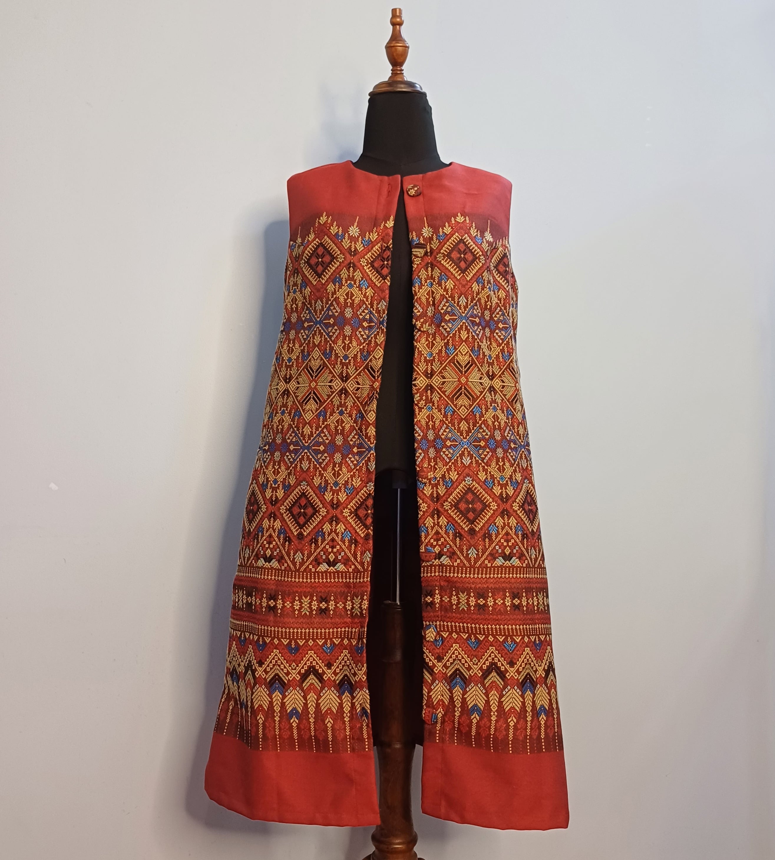 This is a long gilet made from Shan tribal fabric with a snowflake pattern.