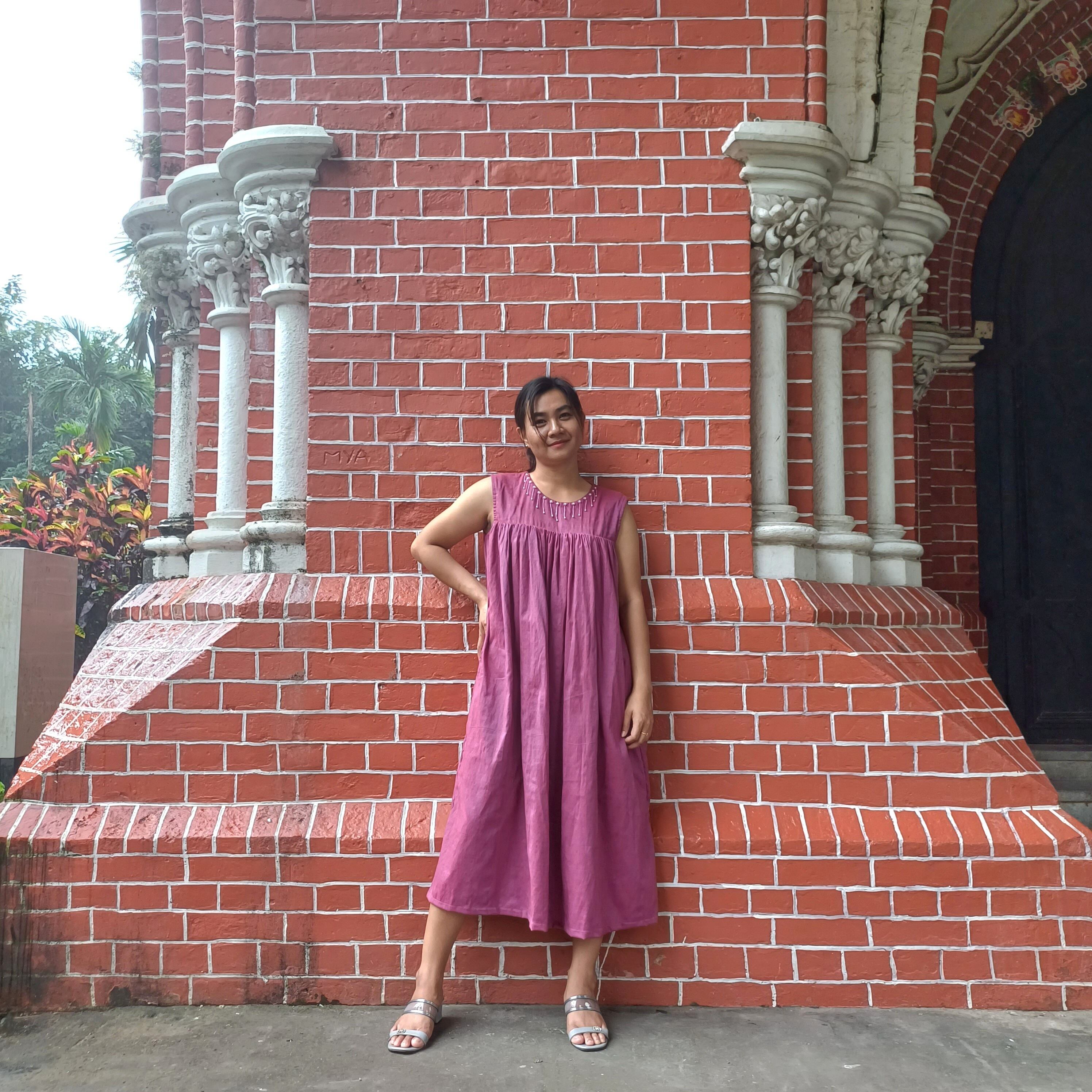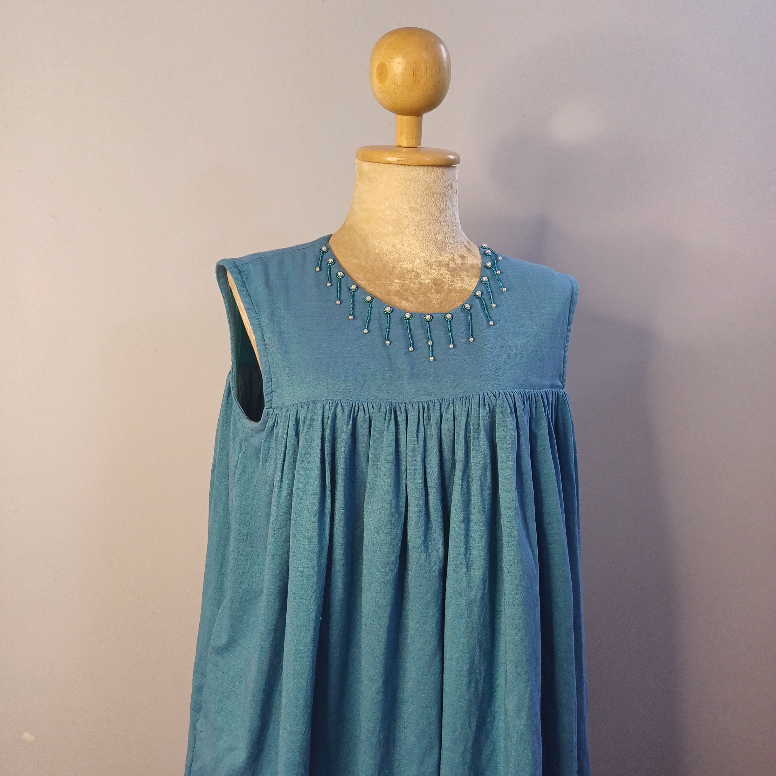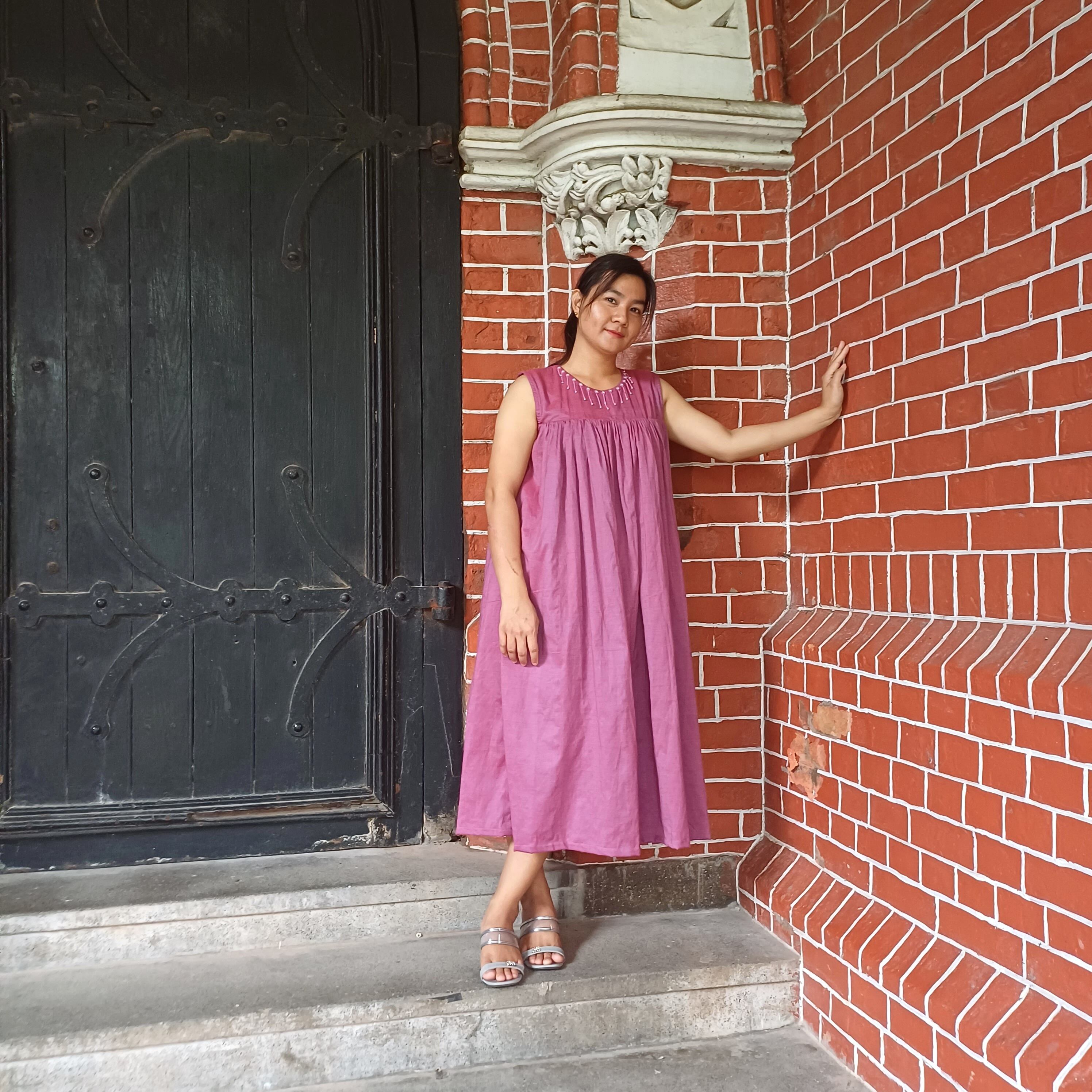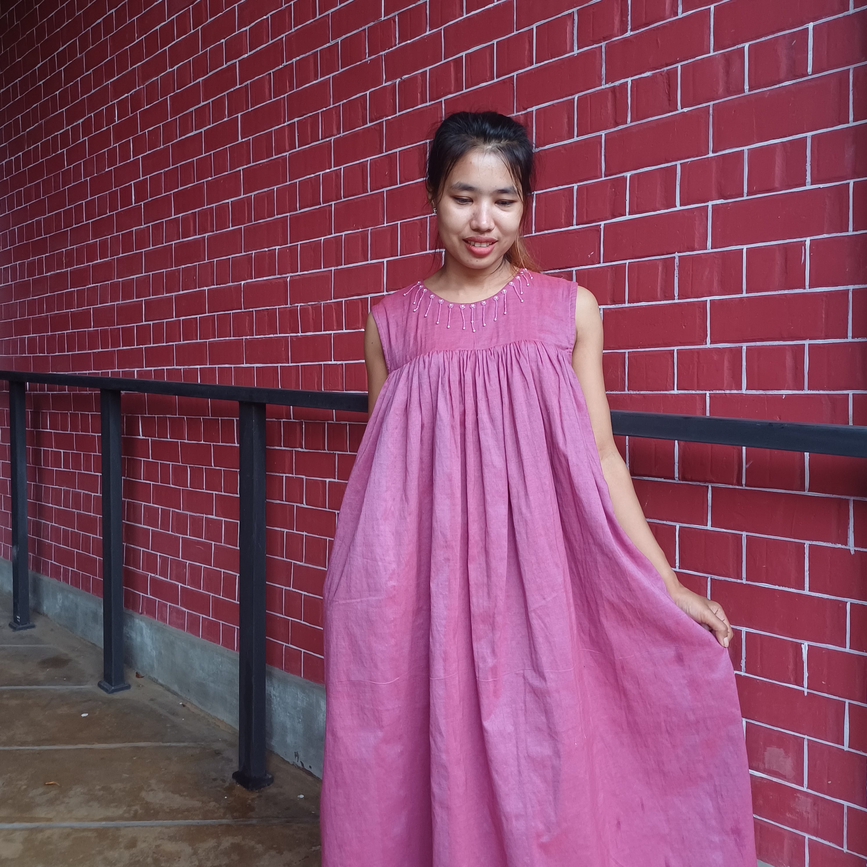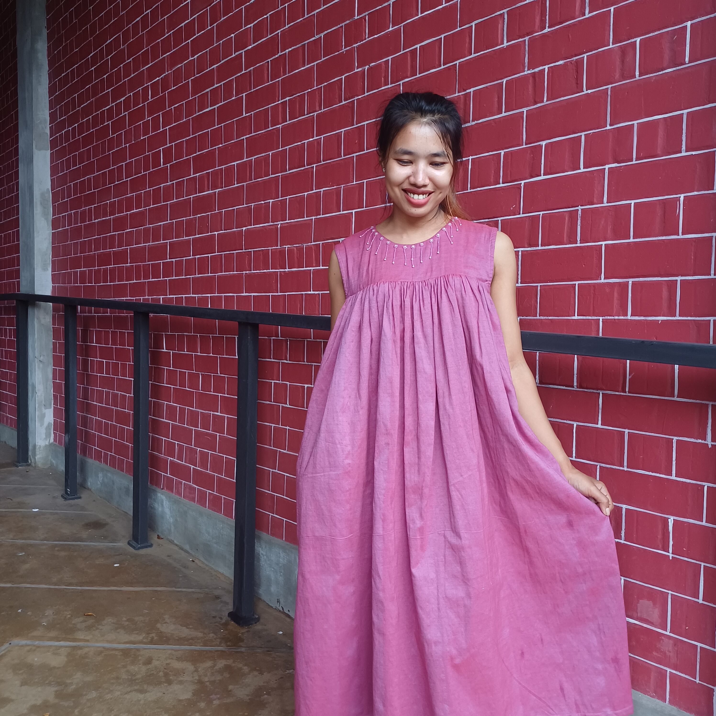 We have created a free-size sleeveless dress using 100% cotton Amarapura fabric, produced in Amarapura, Mandalay, Myanmar. The dress features a design with a seam at the bust and gathers for added detail. The neckline is elegantly adorned with pearl beads, creating a sophisticated look. Being free-size, it can accommodate a wide range of customers.