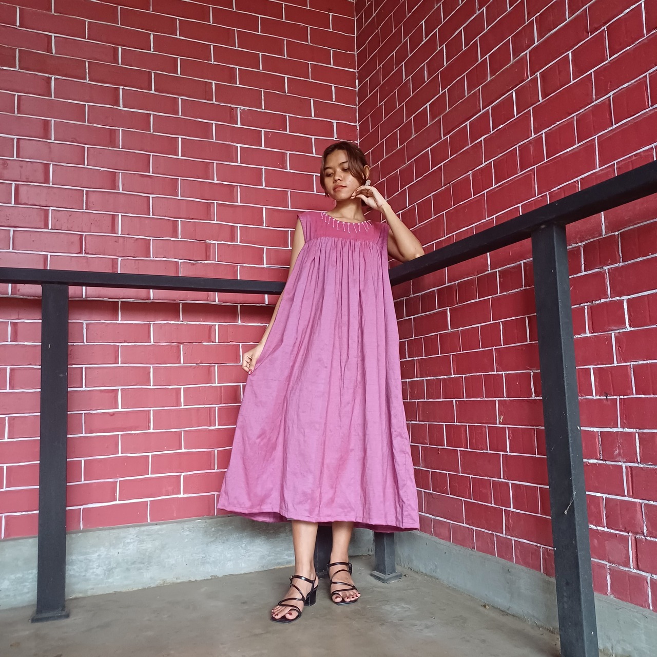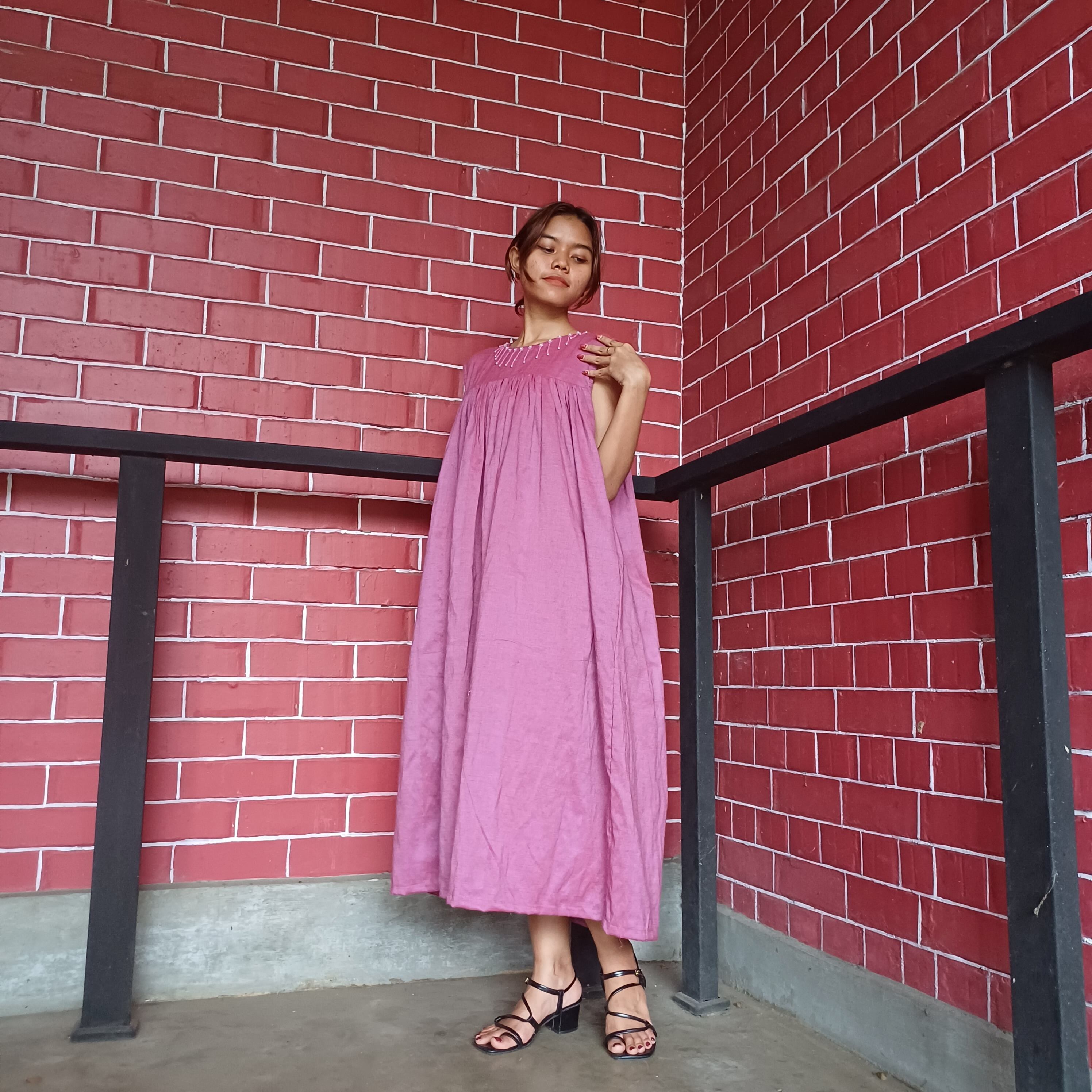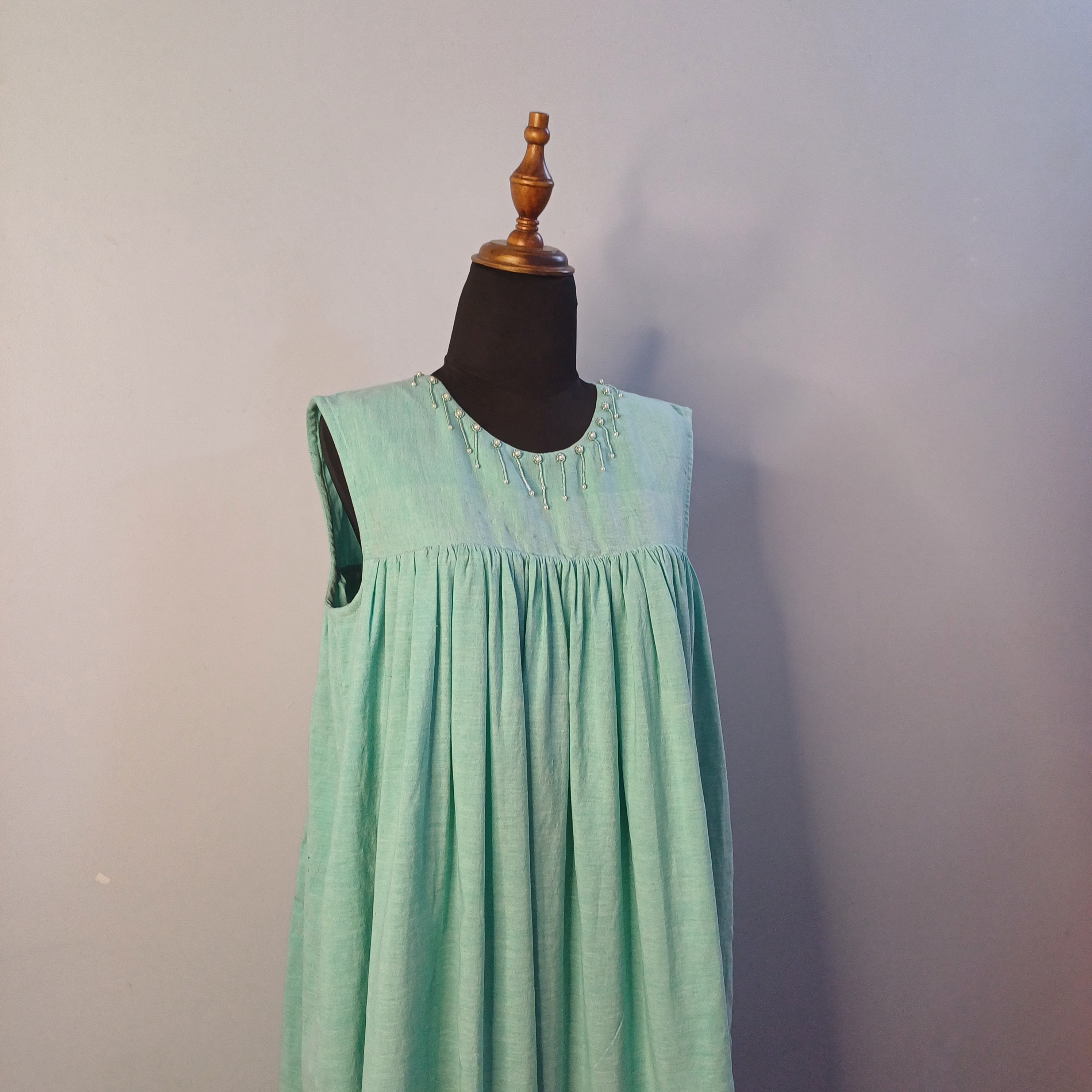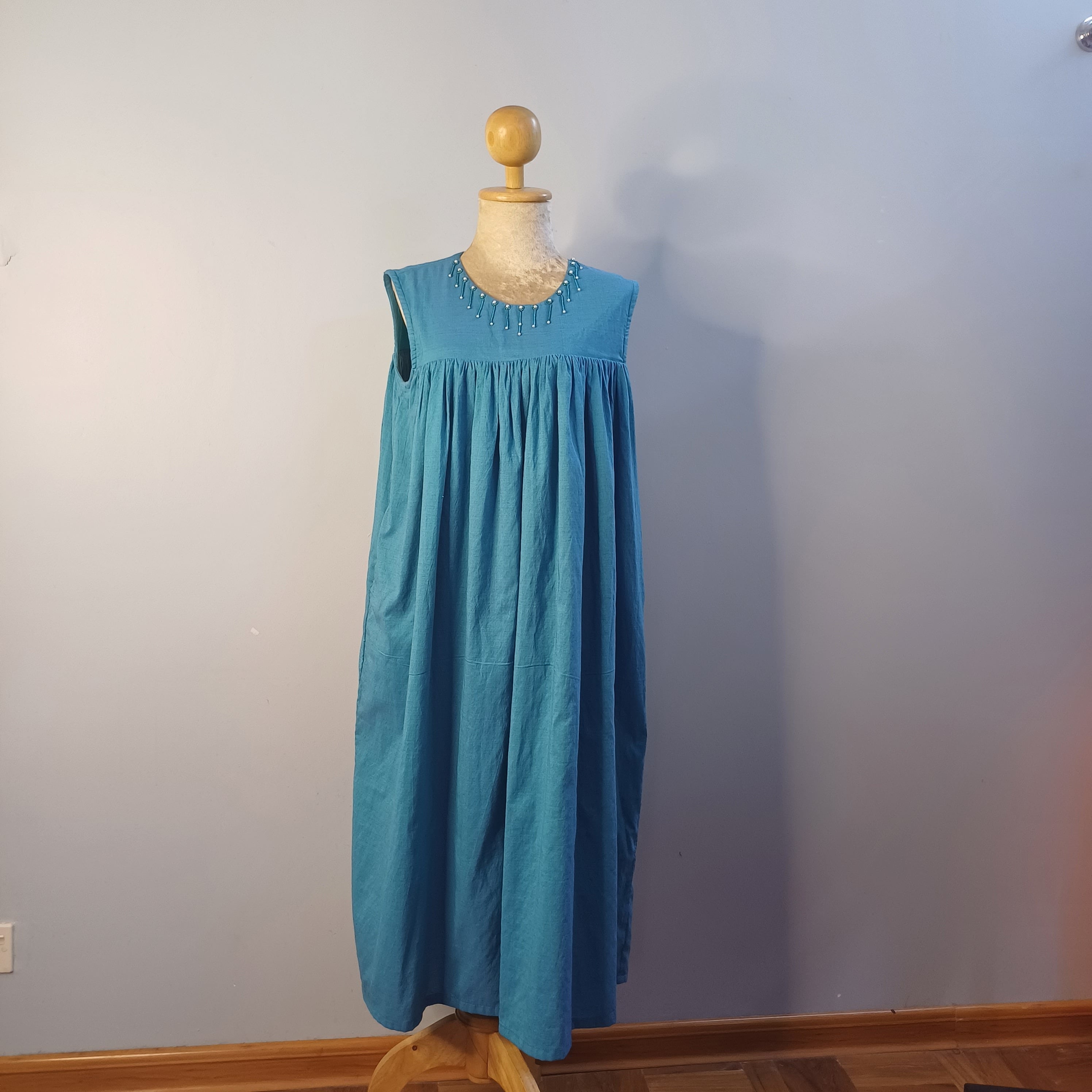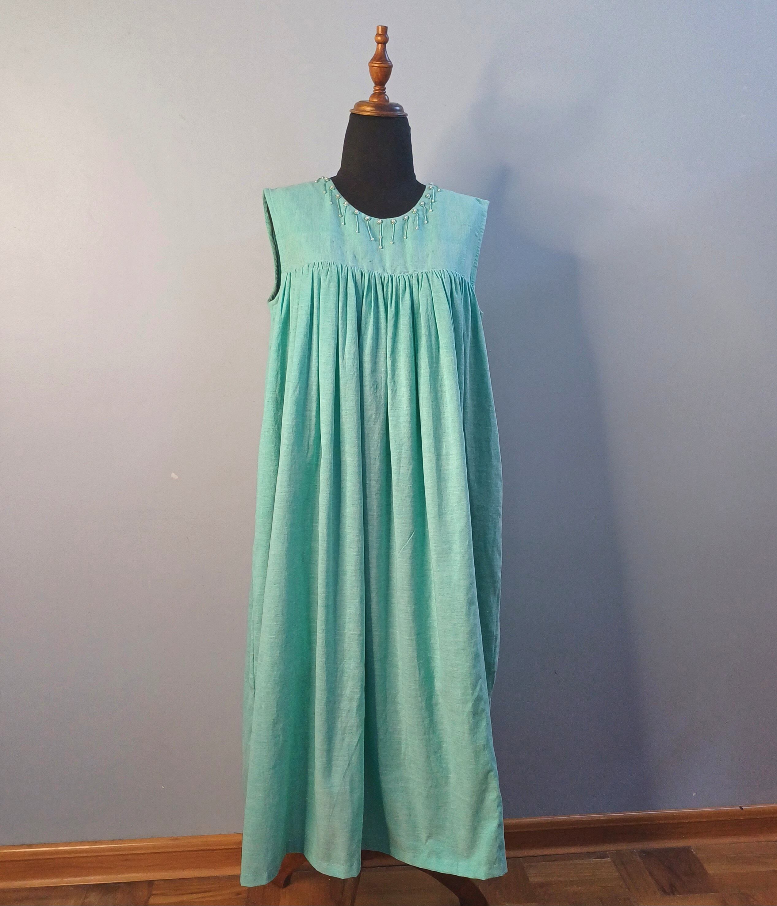 We have created a free-size sleeveless dress using 100% cotton Amarapura fabric, produced in Amarapura, Mandalay, Myanmar. The dress features a design with a seam at the bust and gathers for added detail. The neckline is elegantly adorned with pearl beads, creating a sophisticated look. Being free-size, it can accommodate a wide range of customers.