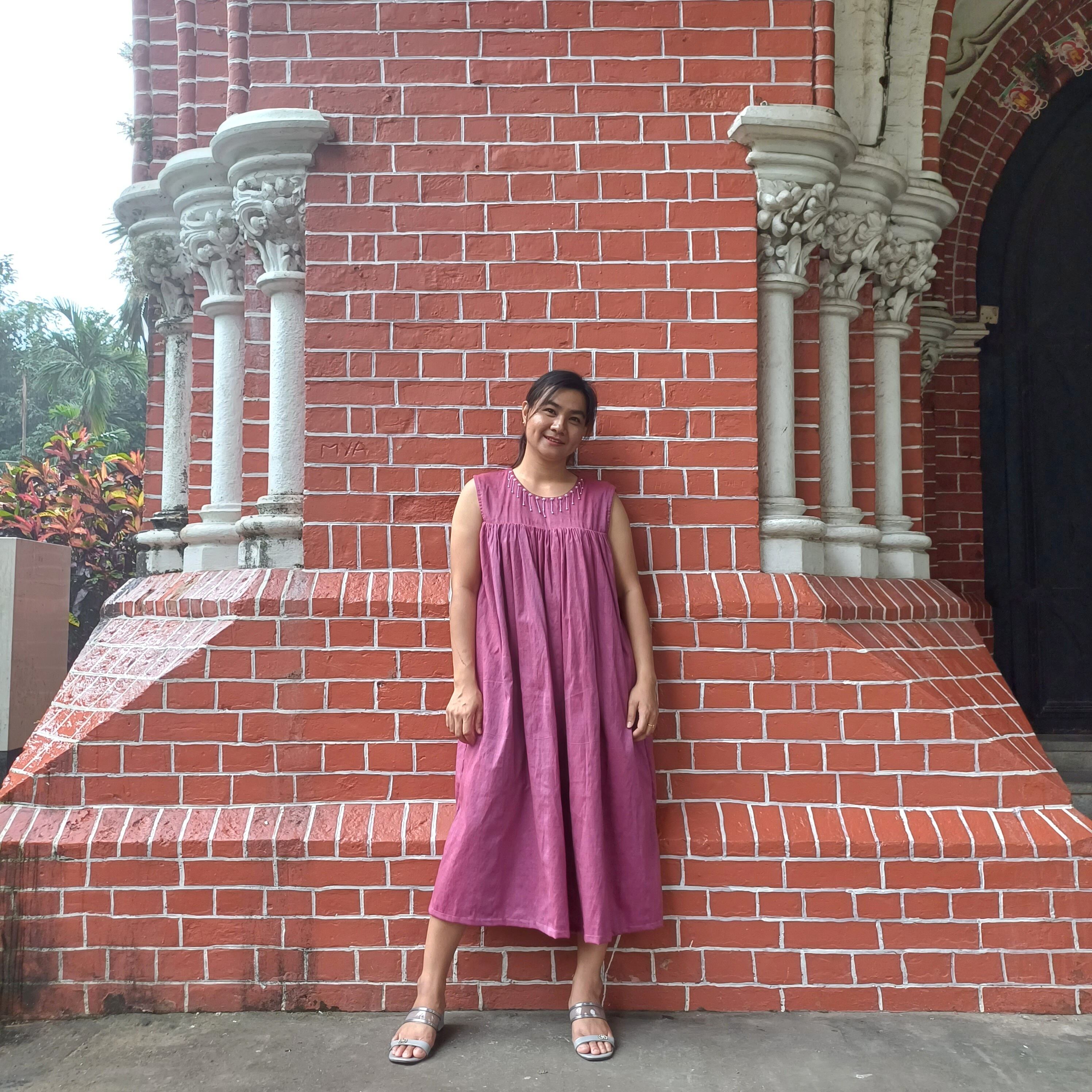 ミャンマー・マンダレーのアマラプラで生産された100%コットンのアマラプラ生地を使用し、フリーサイズのノースリーブドレスを作りました。このドレスは、バスト部分に切り返しがあって、ギャザーを入れたデザインです。襟元にはパールビーズをあしらい、エレガントな雰囲気を演出しています。フリーサイズですので、幅広いお客様にご着用いただけます。