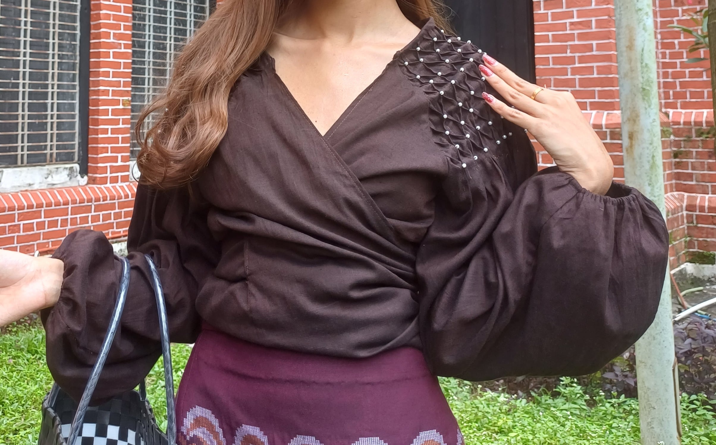 A V-neck wrap-style top that beautifully accentuates the neckline. The waist can be tied with a ribbon, creating a flattering silhouette. The voluminous frills at the cuffs, known as candy sleeves, add a touch of elegance with their delicate sheer finish. Pearl beads adorning the shoulders enhance the elegant charm, perfect for a sophisticated look.